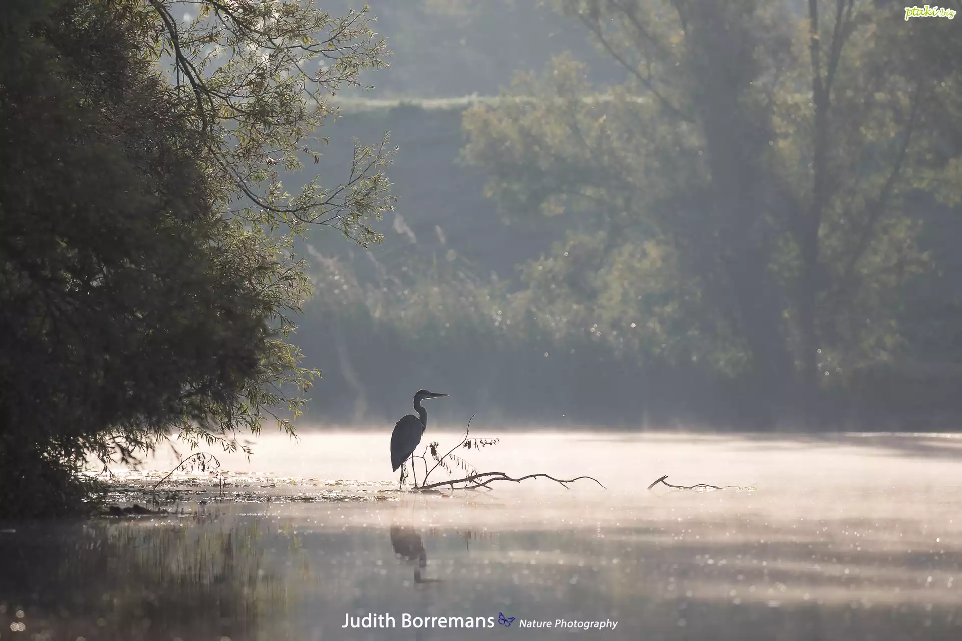 Jezioro, Las, Drzewa, Gałęzie, Szuwary, Mgła, Czapla