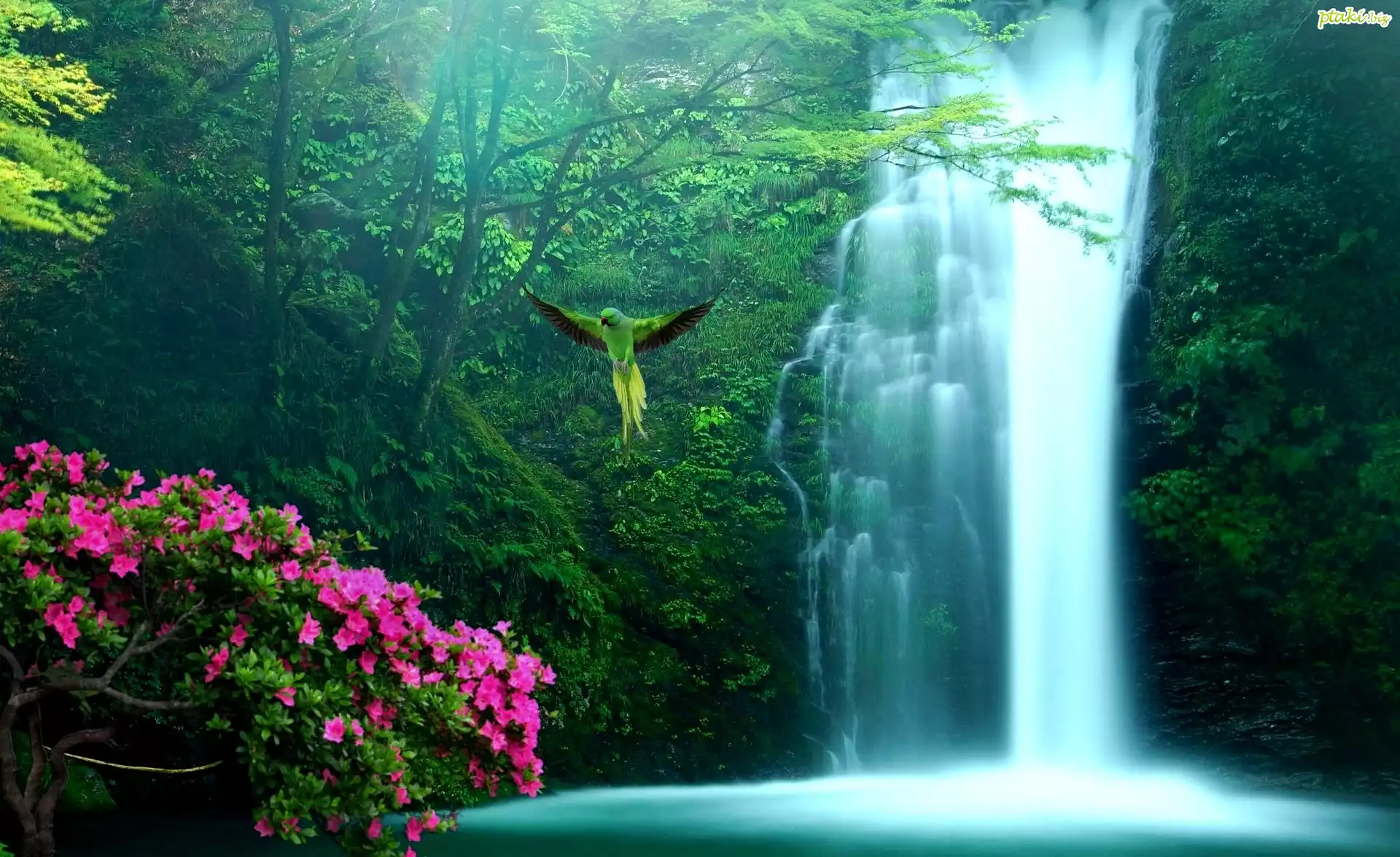 Las, Wodospad, Kwiaty, Papuga