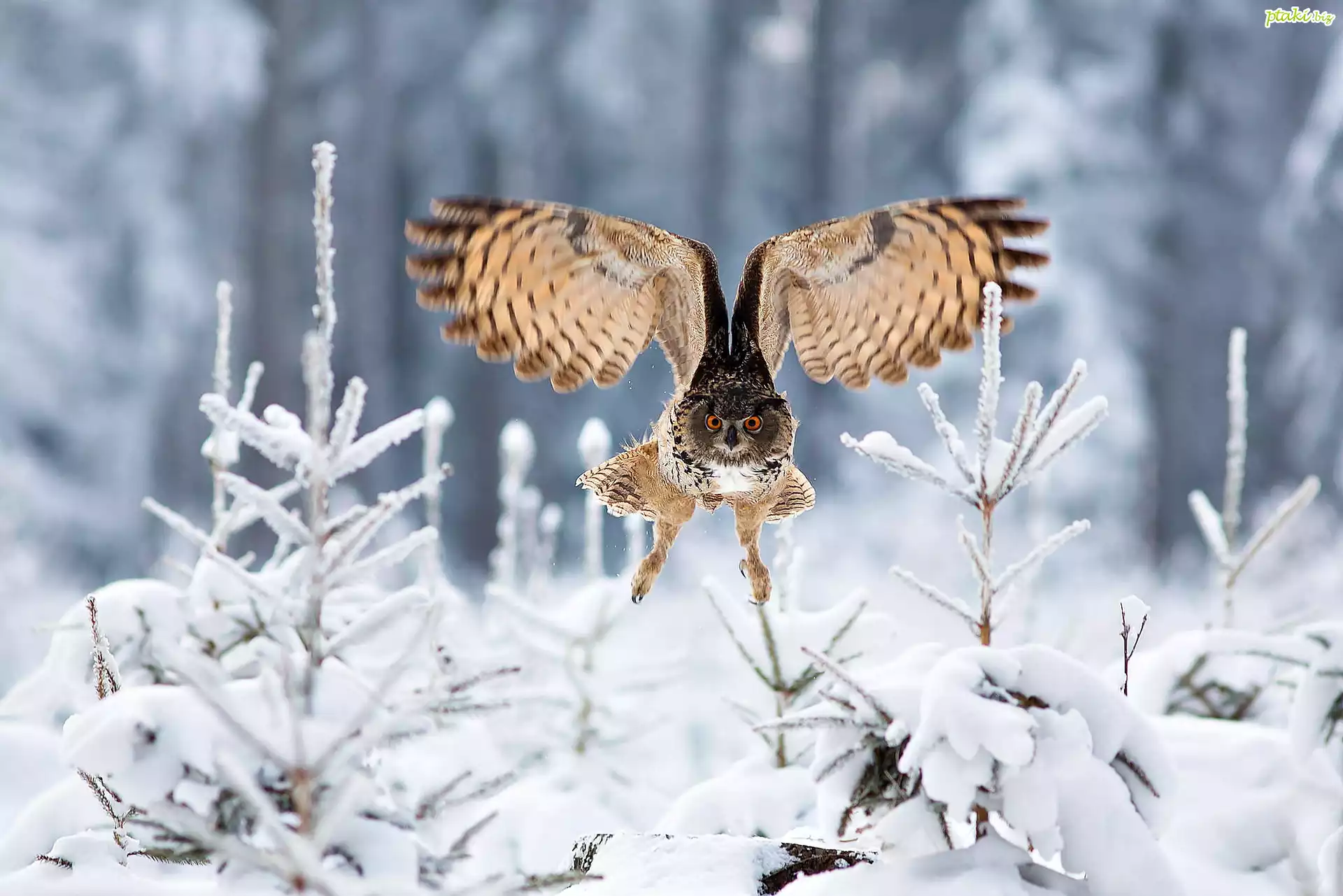 Lecąca, Sowa, Zima, Ośnieżone, Drzewa