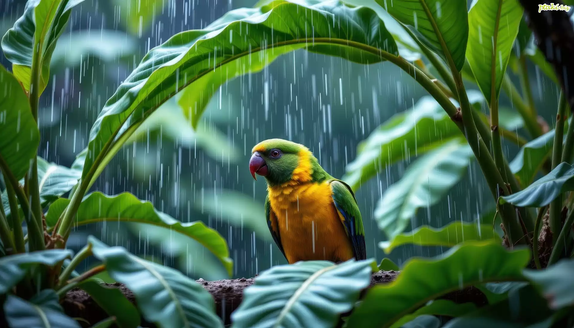 Zielono-żółta, Papuga, Liście, Deszcz, Grafika AI