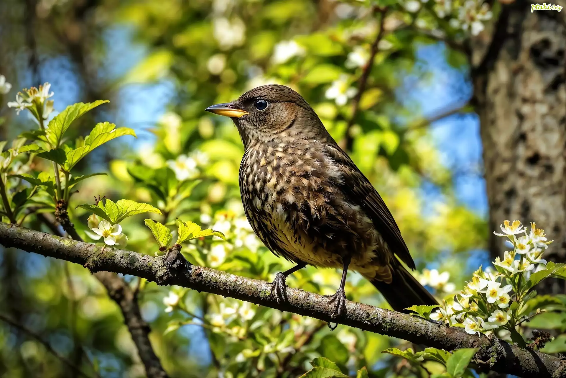 Ptak, Gałąź, Kwiaty, Listki