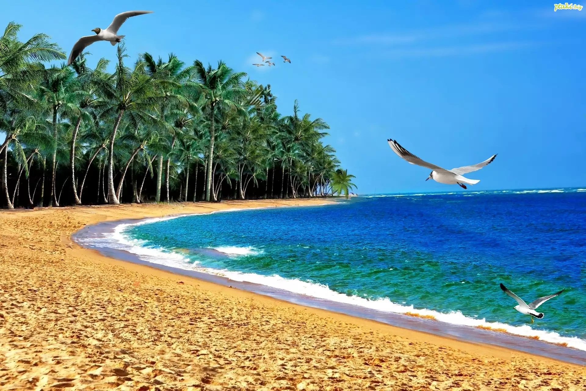 Mewy, Plaża, Morze, Palmy