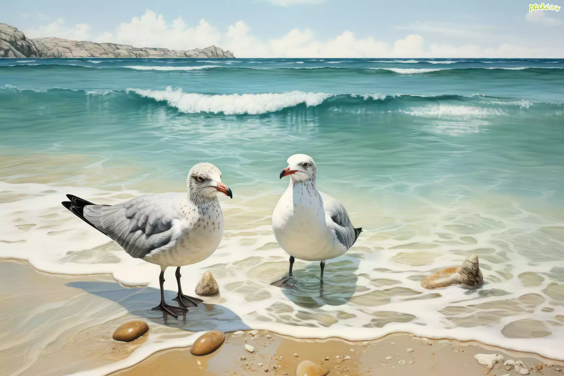 Dwie, Mewy, Plaża, Morze, Grafika