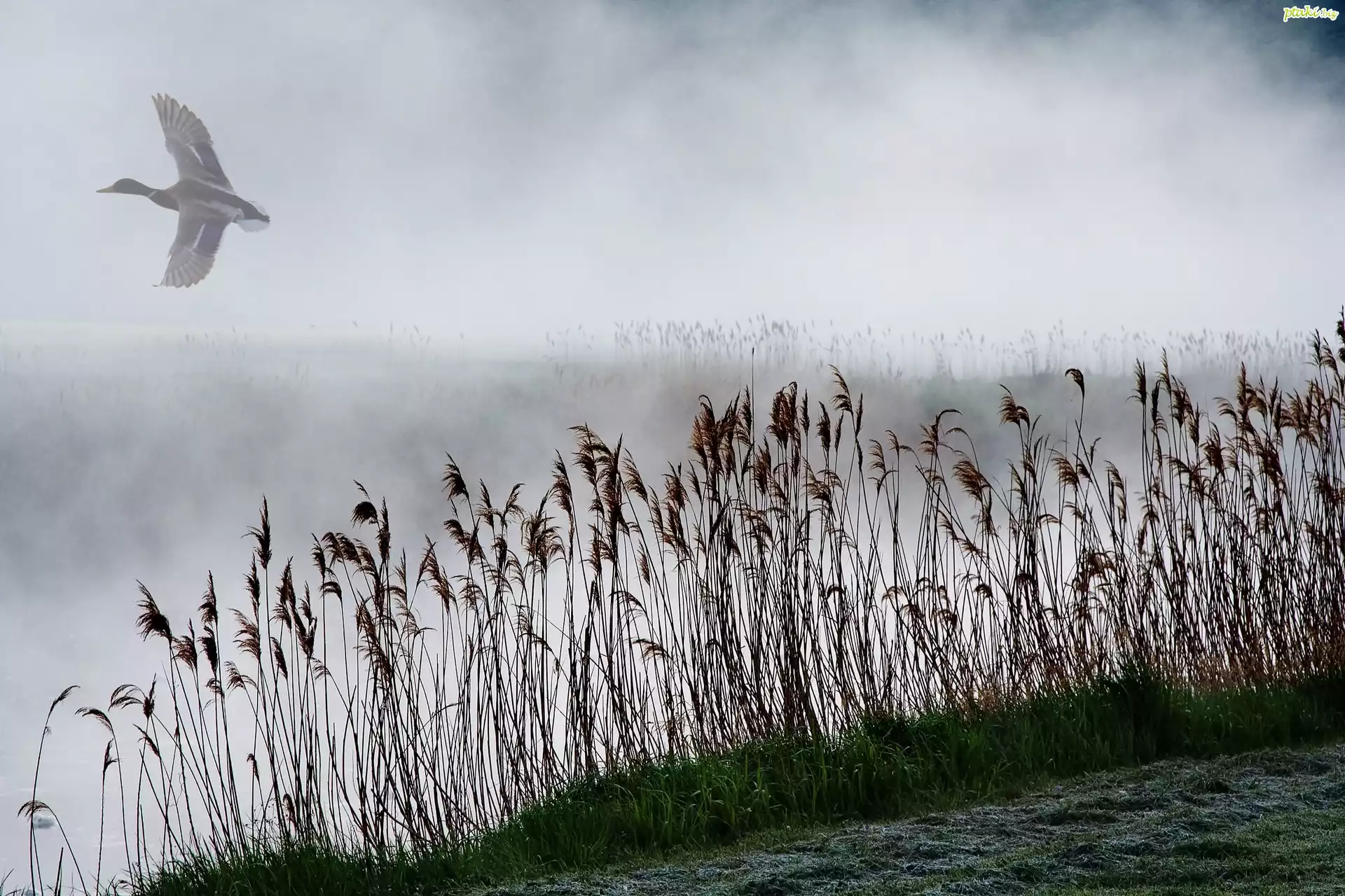 Mgła, Jezioro, Trawa, Kaczka