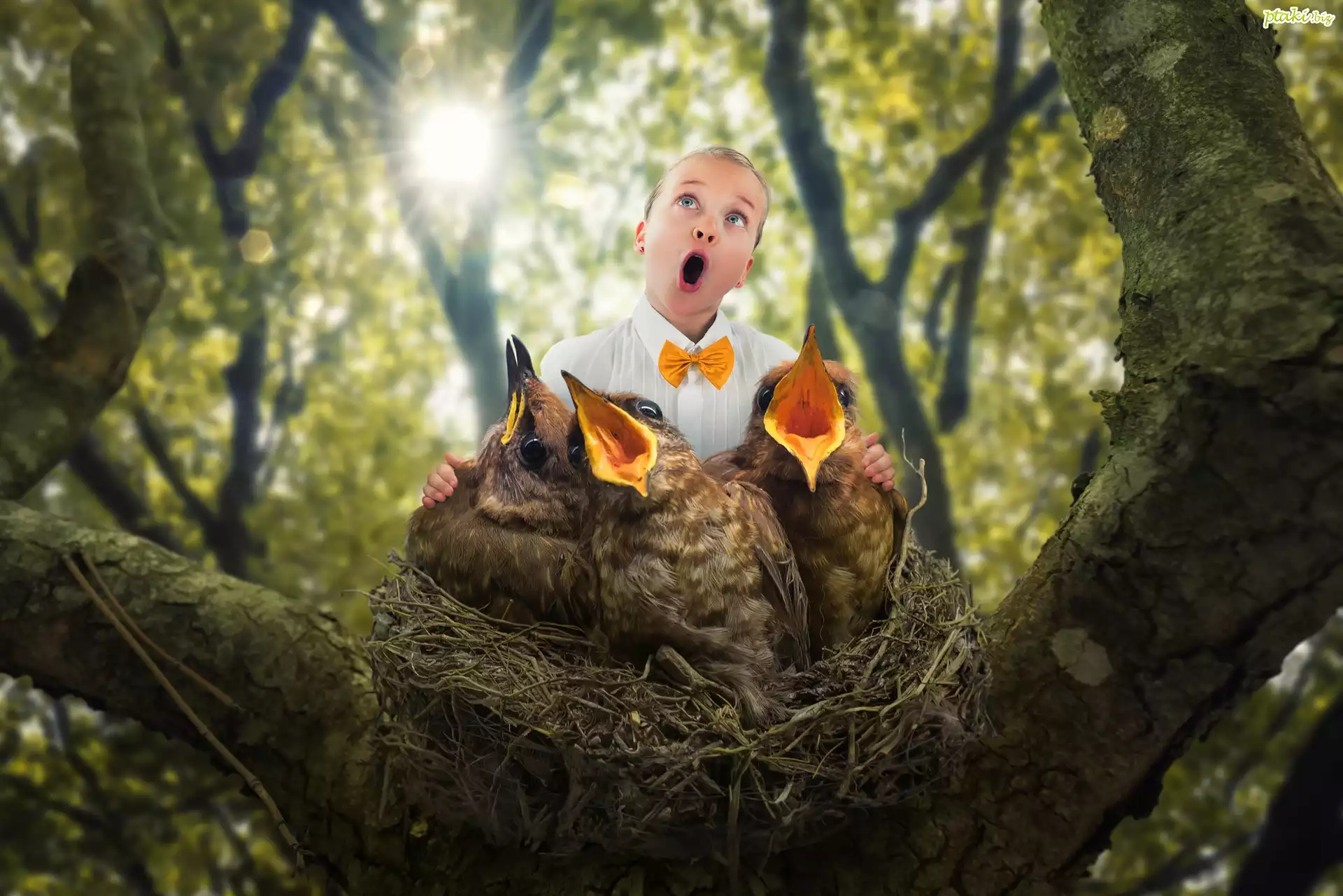 Śmieszne, Drzewo, Ptaki, Gniazdo, Dziecko, Chór