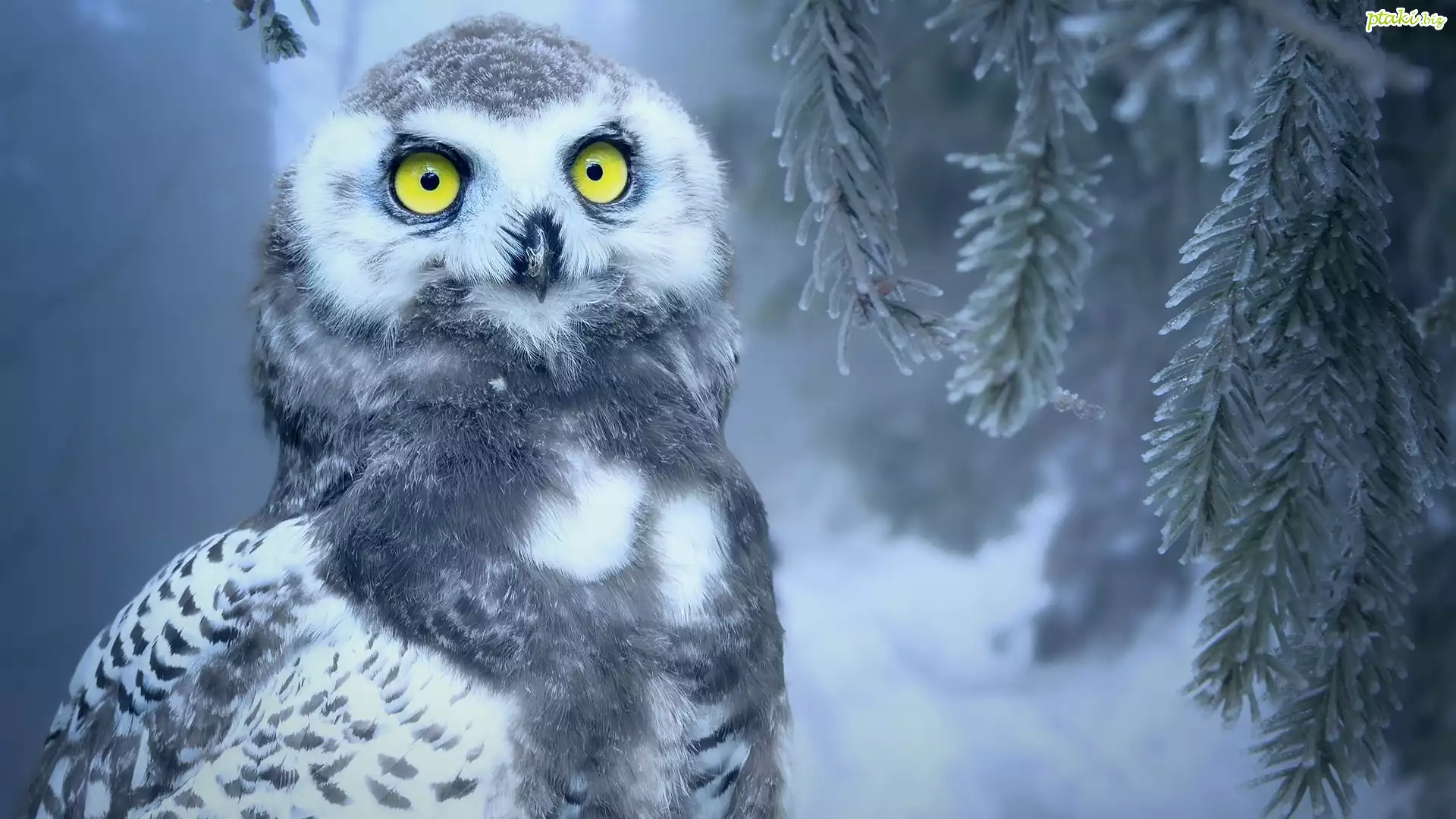 Ptak, Młoda, Sowa śnieżna, Żółte, Oczy, Gałązka