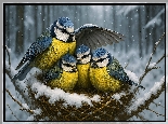 Zima, Ptaki, Sikorka, Modraszka zwyczajna, Gniazdo, Pisklęta