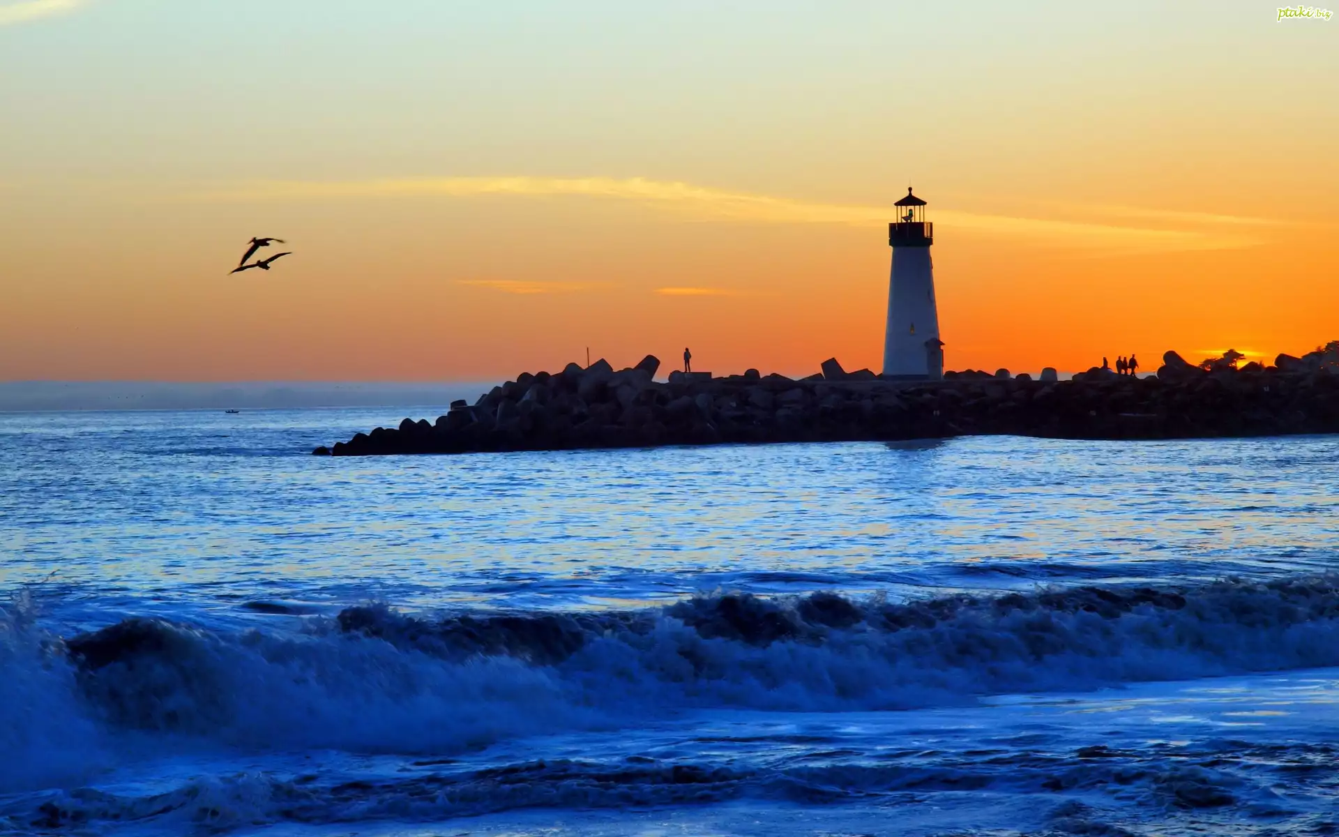 Latarnia, Morska, Morze, Fale, Ptaki, Zachód, Słońca