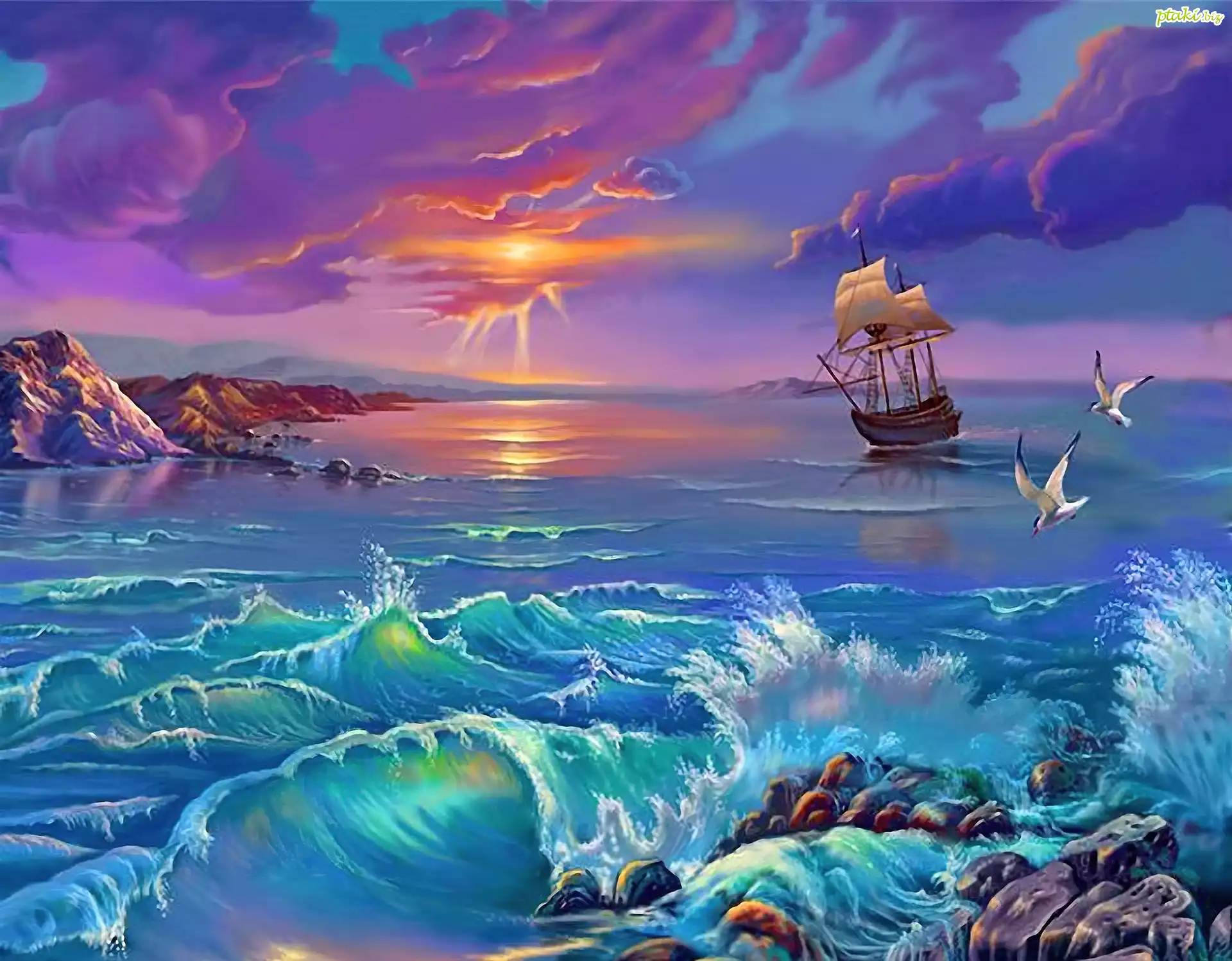 Morze, Fale, Żaglowiec, Zachód, Słońca, Mewy