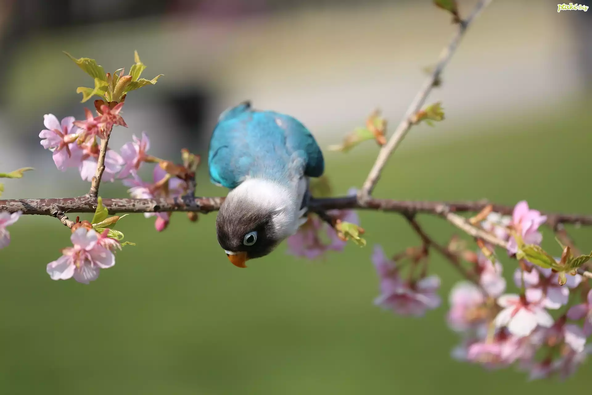 Papużka, Niebieska, Nierozłączka czarnogłowa, Gałązka, Kwiaty, Wiosna