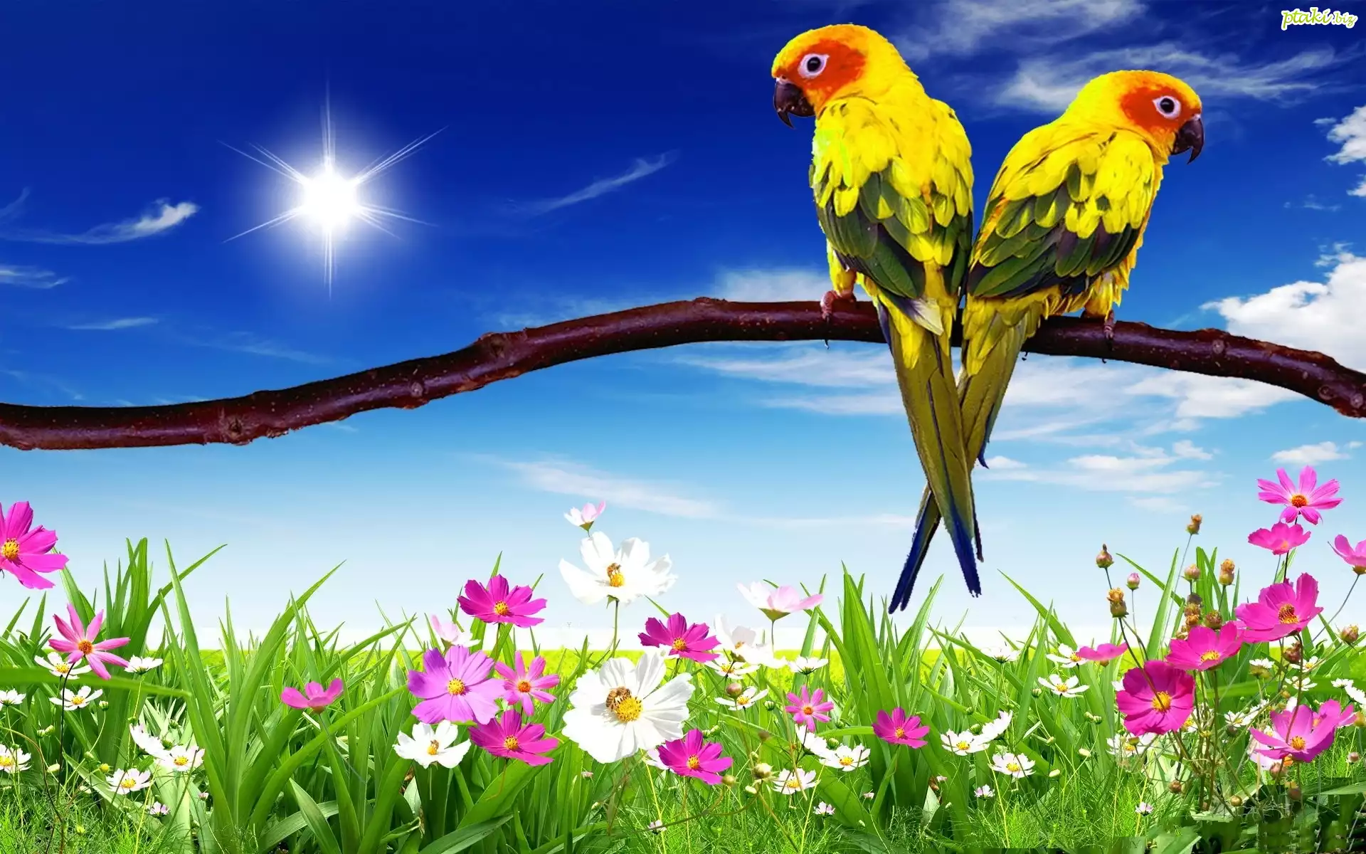 Niebo, Papugi, Gałąź, Kwiaty