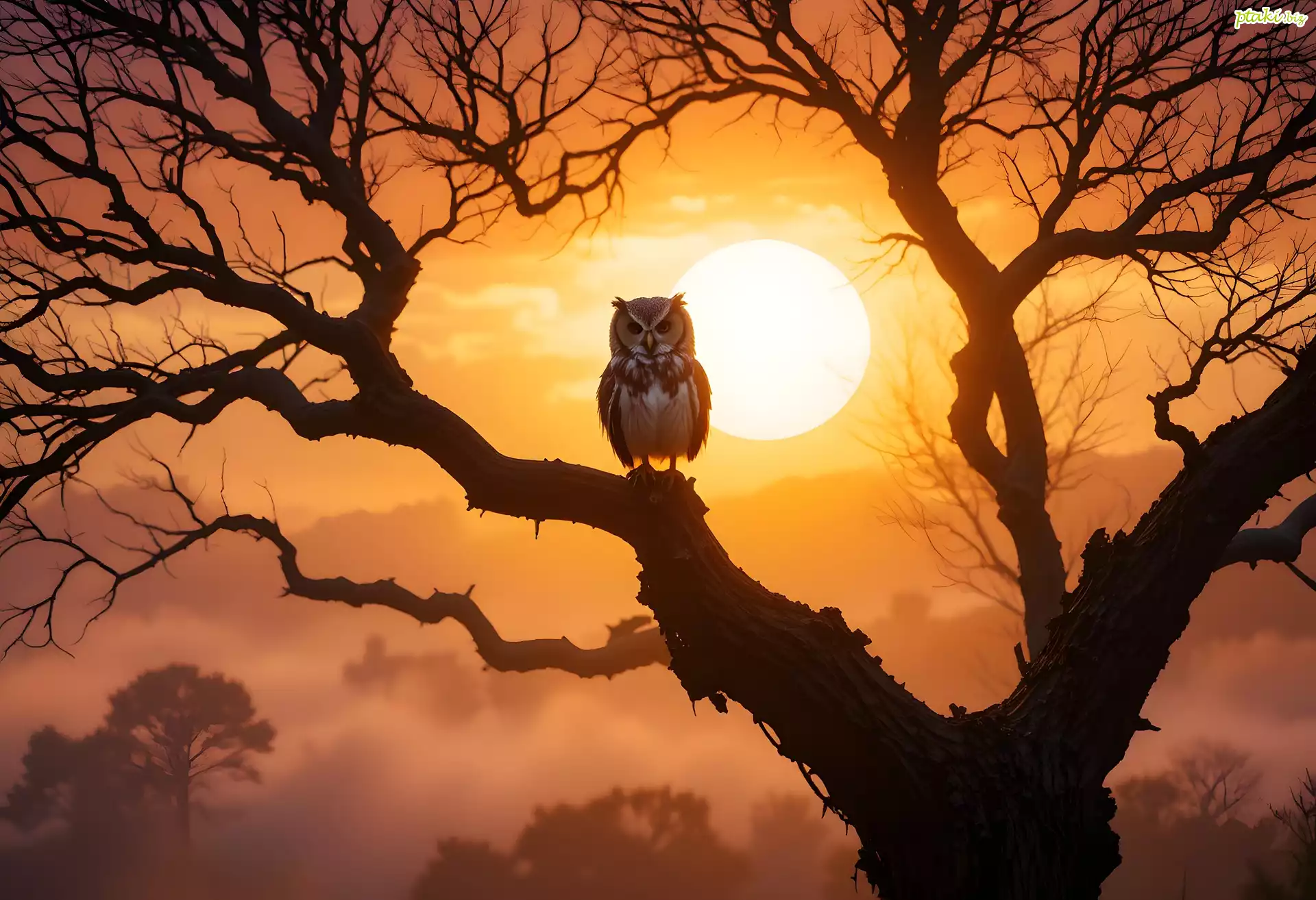 Przyroda, Natura, Sowa, Drzewo, Konary, Ptak, Niebo, Zachód, Słońca, Zamglenie, Mgła