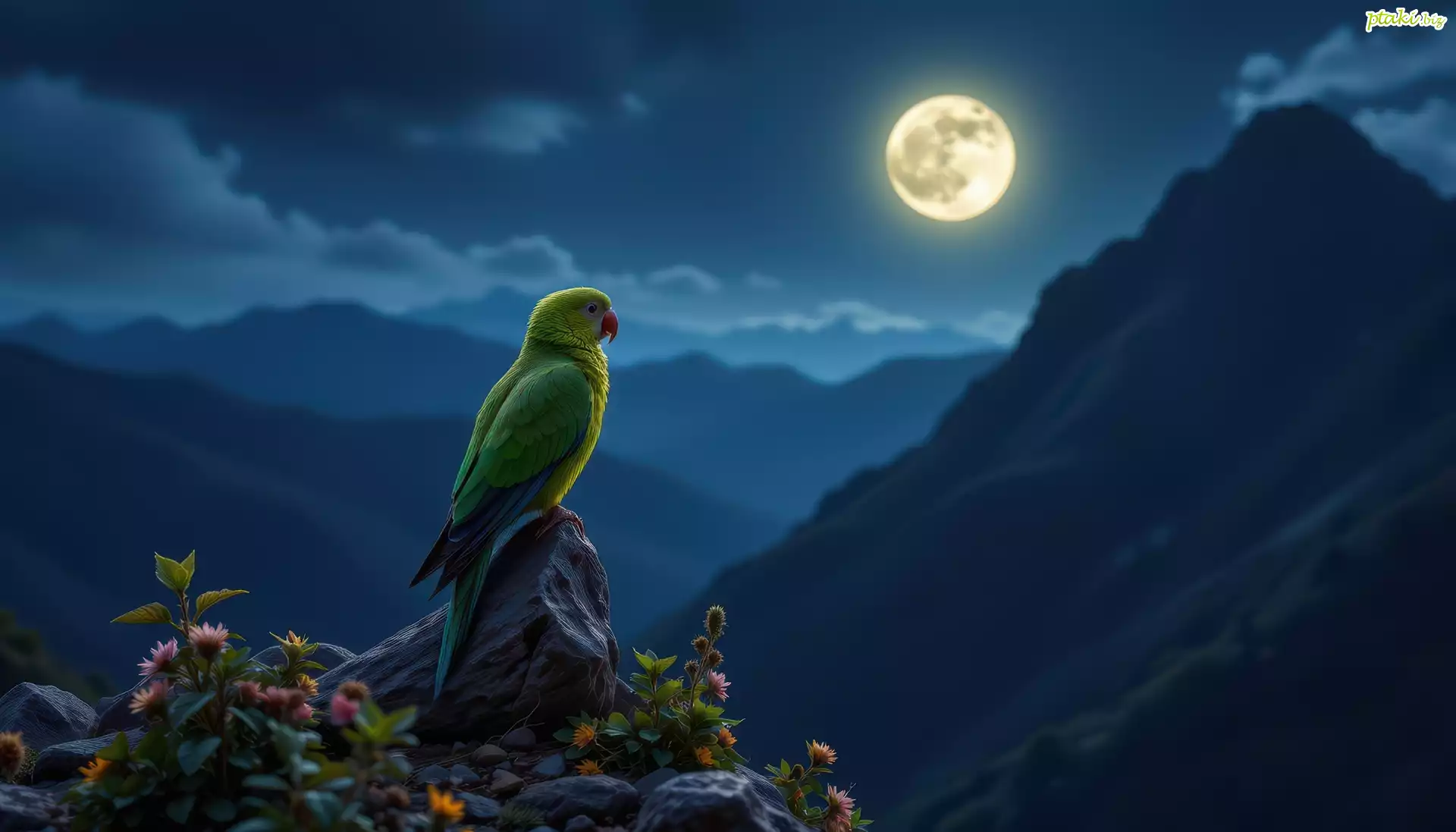 Papuga, Kwiaty, Skała, Noc, Księżyc, Góry