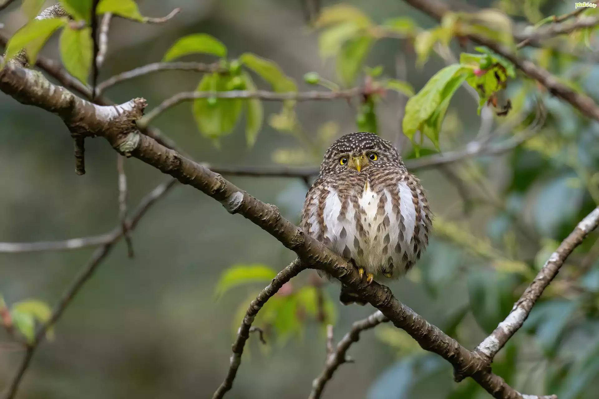 Ptak, Sowa, Sóweczka obrożna, Gałęzie, Liście, Zbliżenie