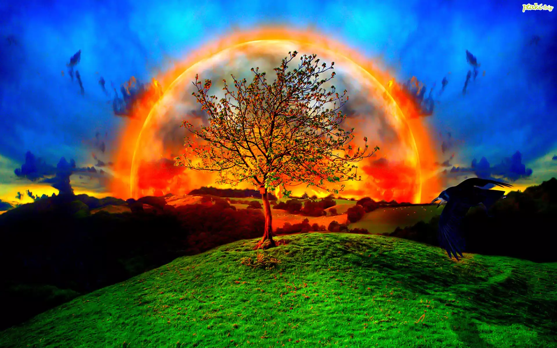 Ognista, Tęcza, Drzewo, Ptak