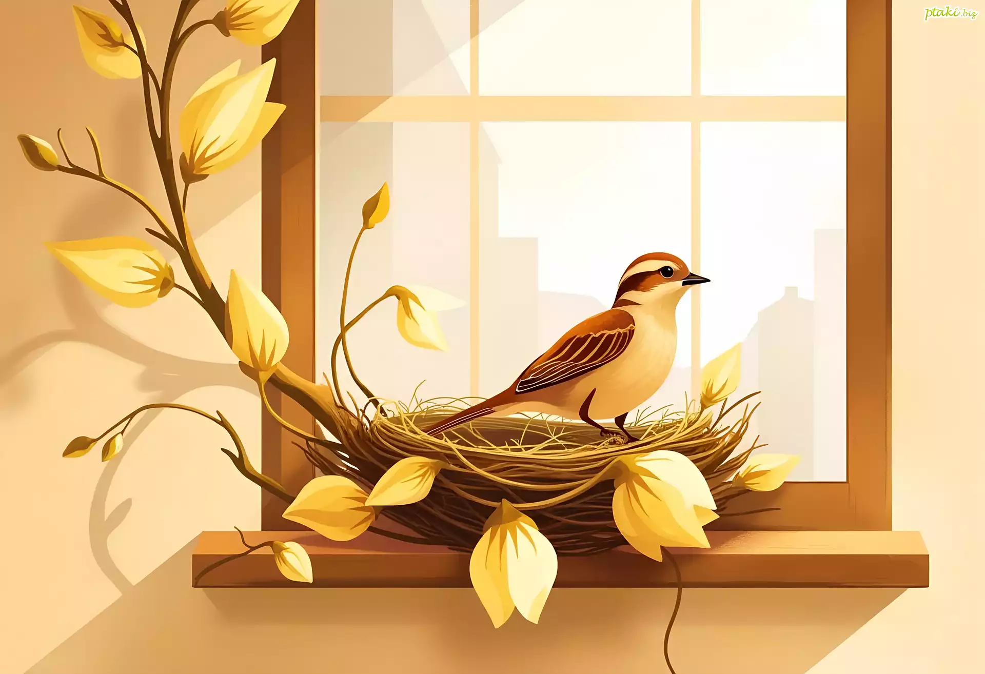 Ptak, Gniazdo, Parapet, Okno, Gałązka, 2D