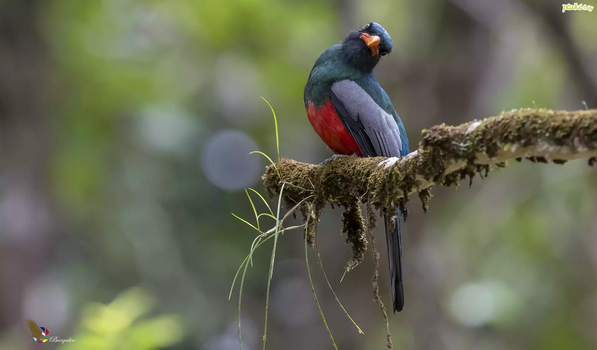 Ptak, Trogon krasnodzioby, Omszała, Gałązka