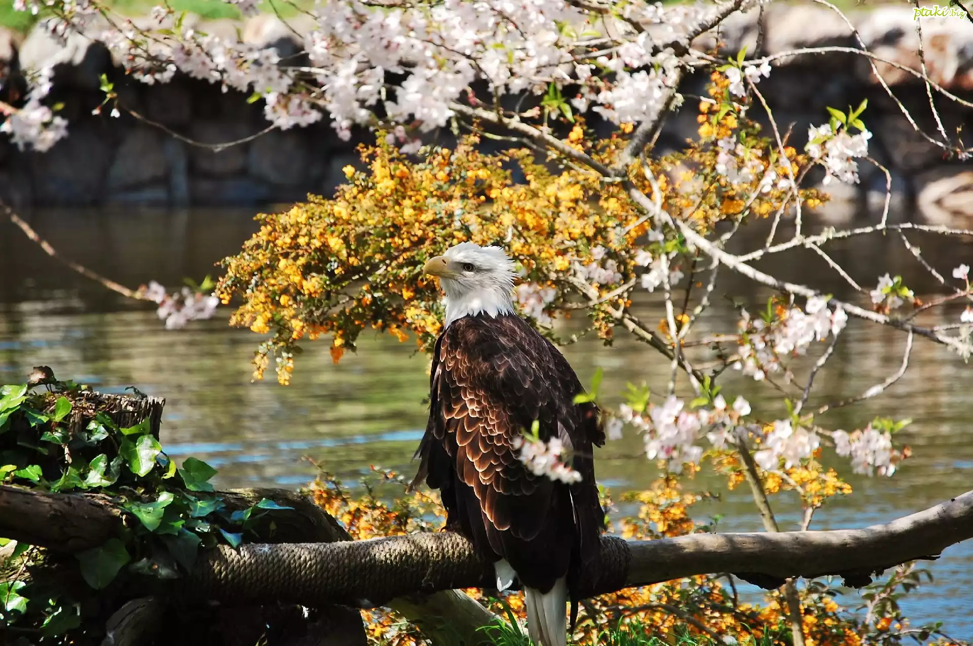 Bielik amerykański, Gałąź, Kwiatki, Woda