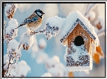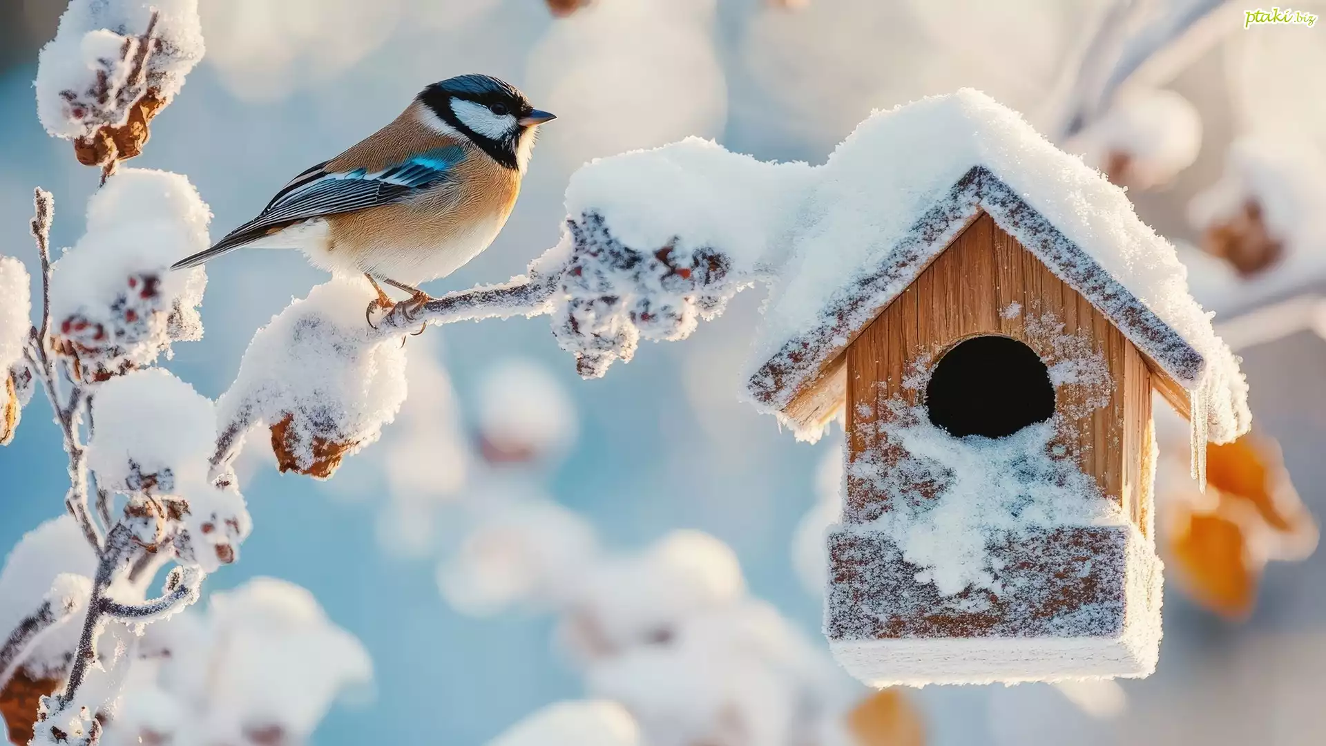 Zima, Ptak, Sikorka, Ośnieżona, Gałązka, Karmnik