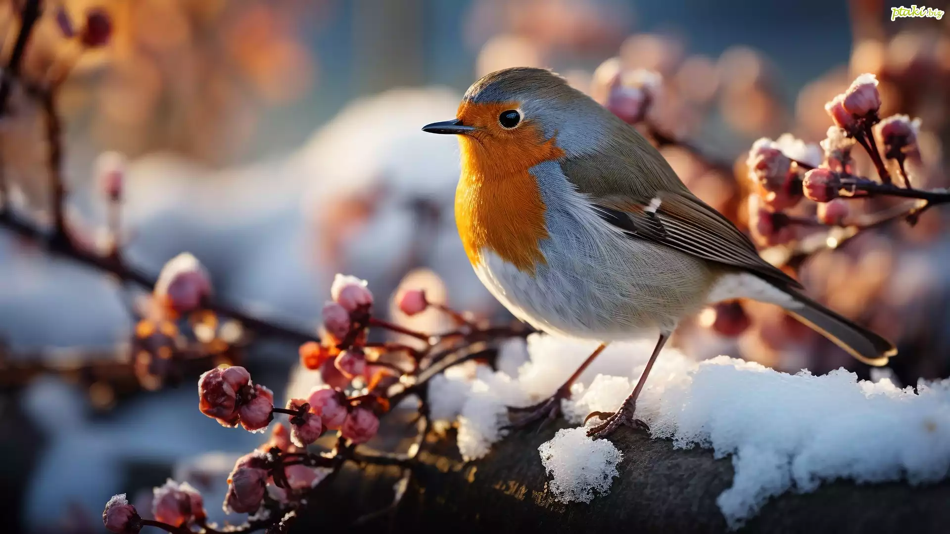 Ptak, Rudzik, Różowe, Pąki, Gałęzie, Śnieg