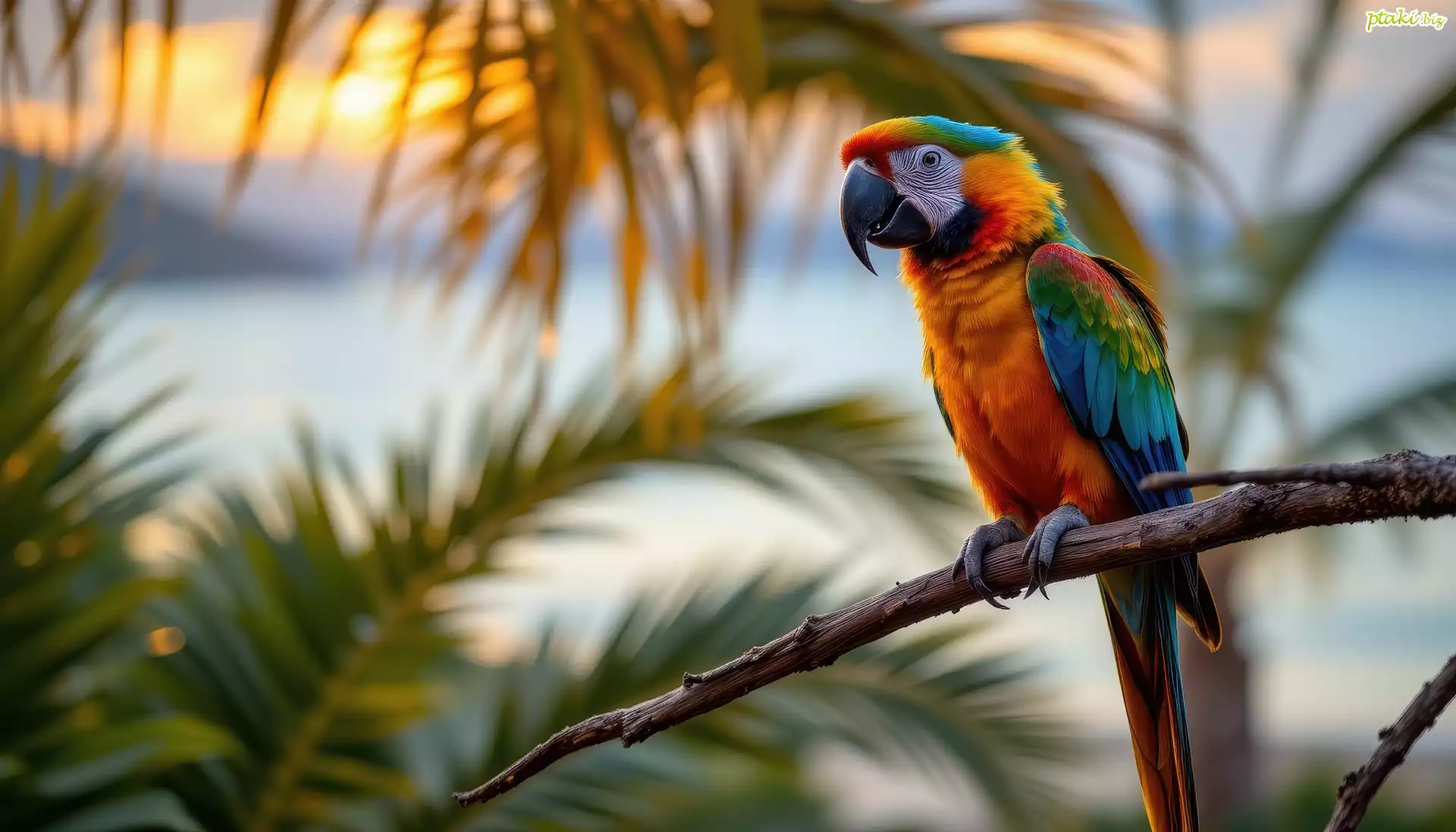 Papuga, Ara, Gałąź, Liście, Zachód słońca, Grafika, Zachód Słońca