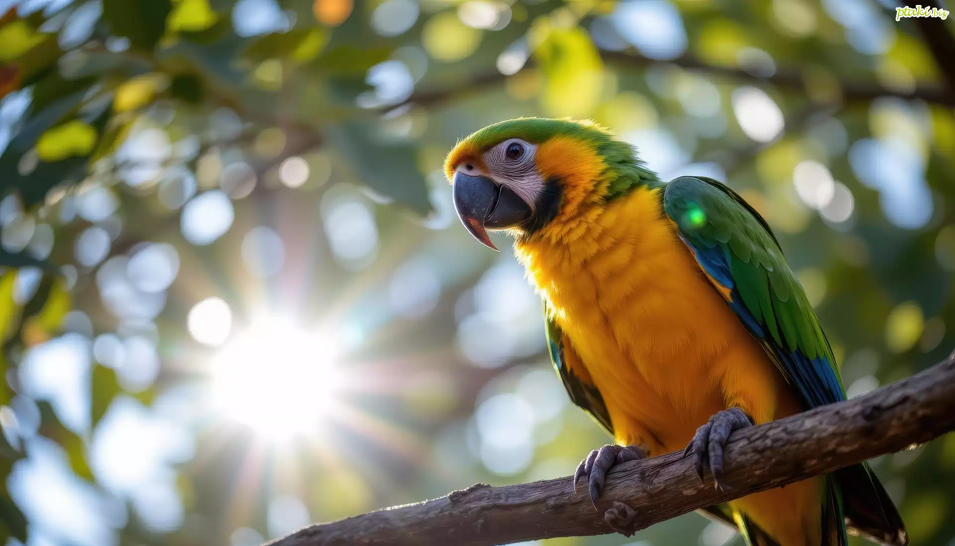 Papuga, Żółto-zielona, Ara, Gałąź, Promienie słońca, Grafika AI