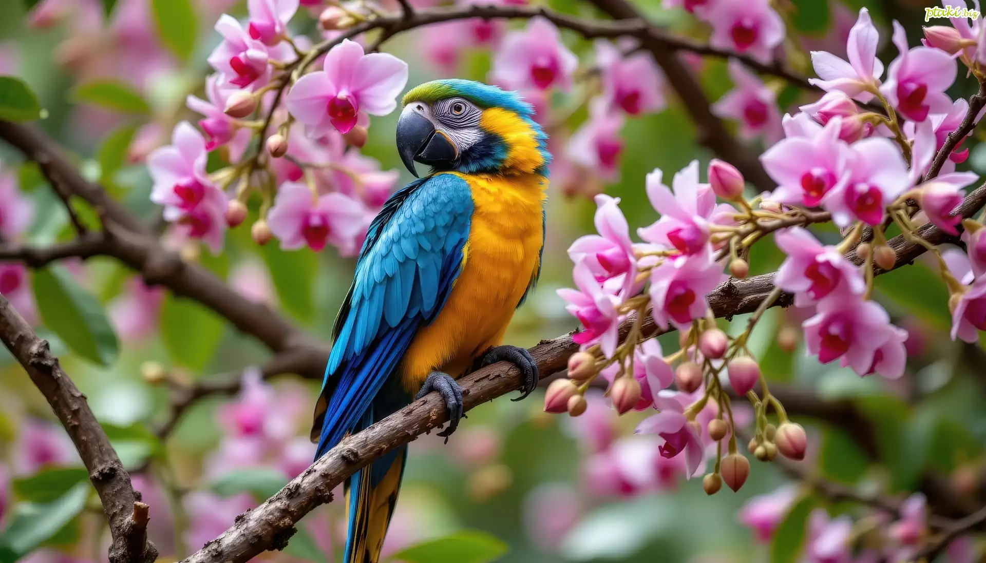 Kwiaty, Gałązki, Storczyki, Papuga, Niebiesko-żółta, Ara