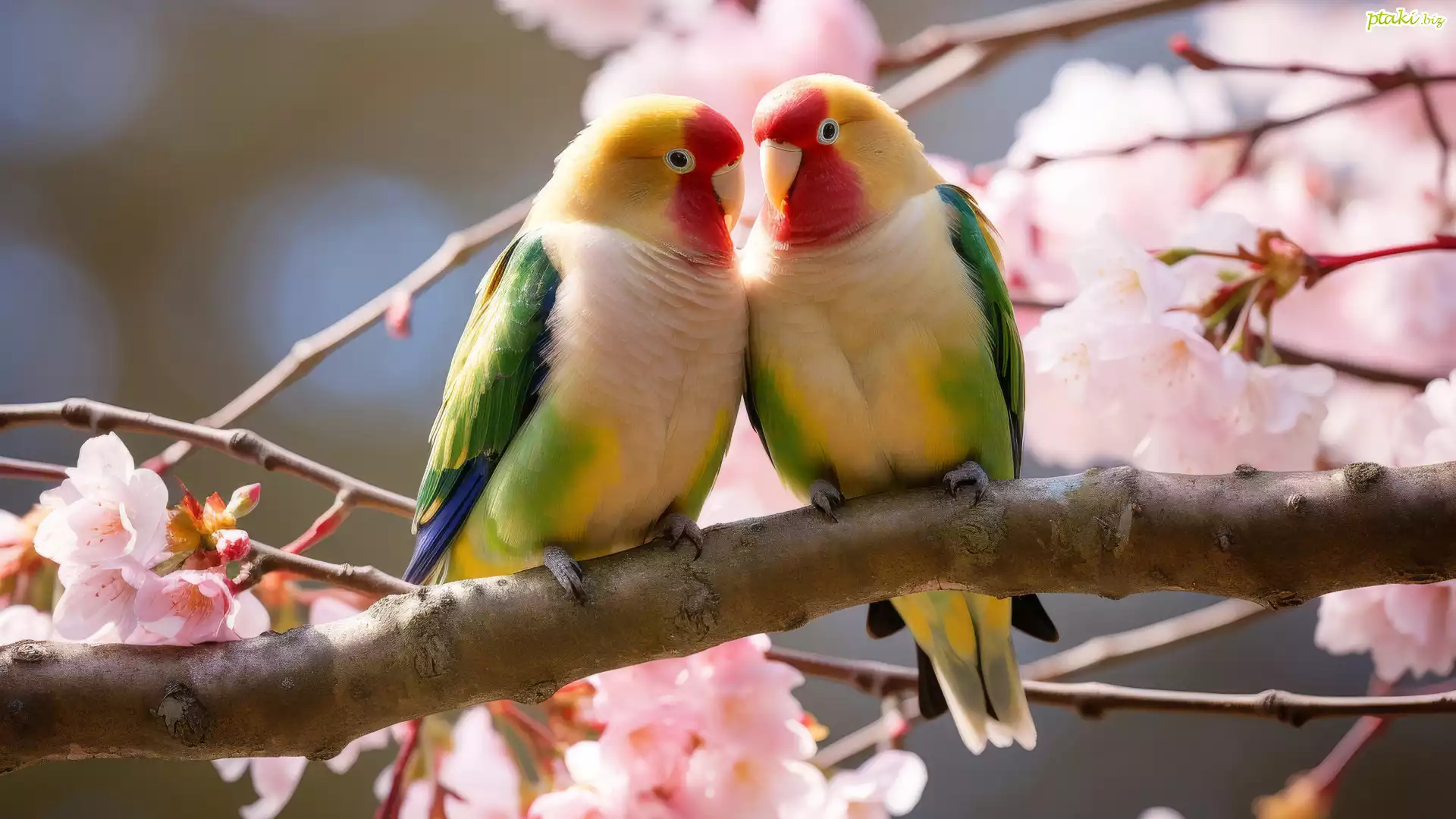 Gałąź, Ptaki, Papugi, Papużki nierozłączki, Kwiaty