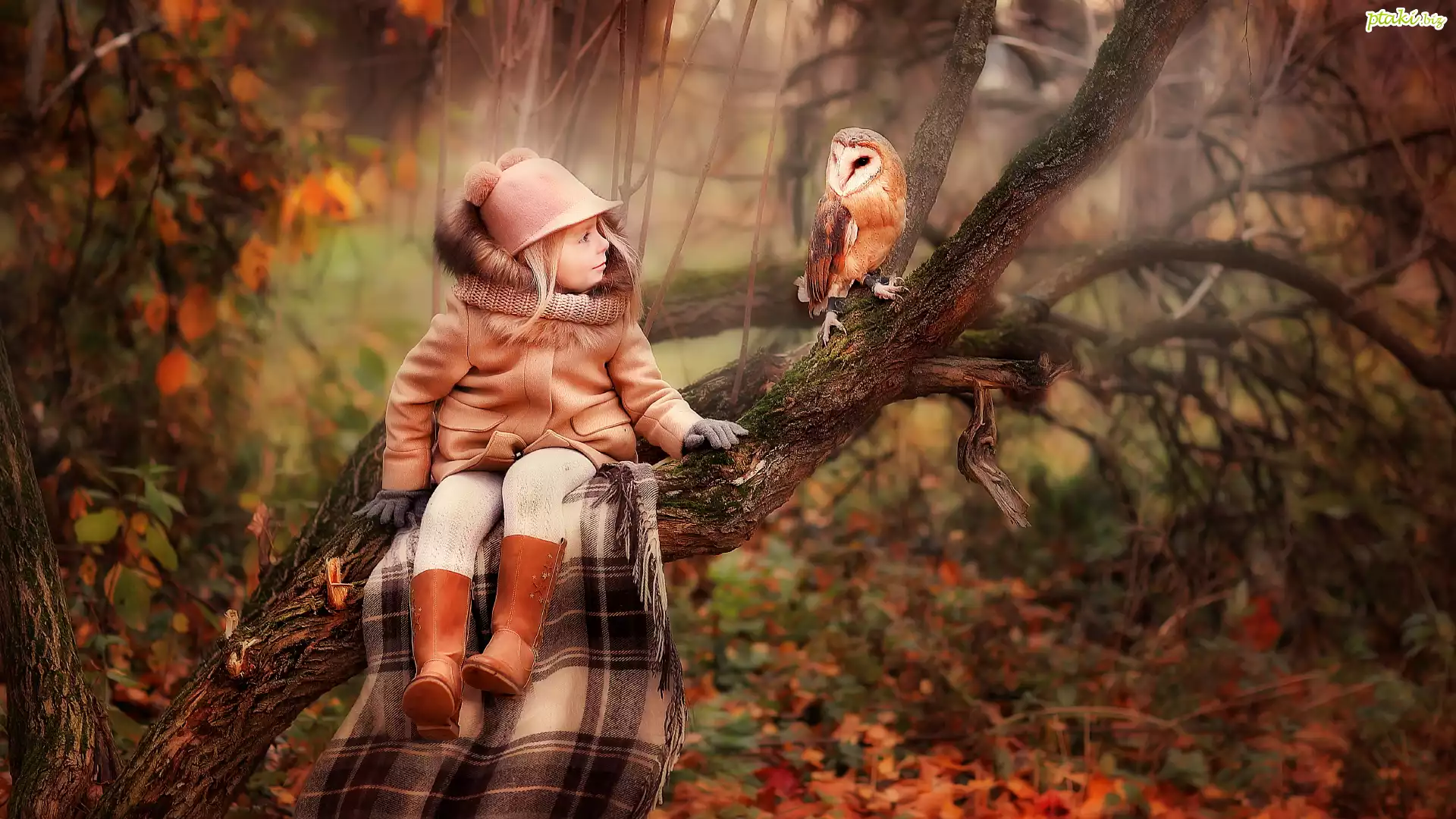 Dziewczynka, Płaszczyk, Czapka, Drzewo, Koc, Sowa, Płomykówka zwyczajna