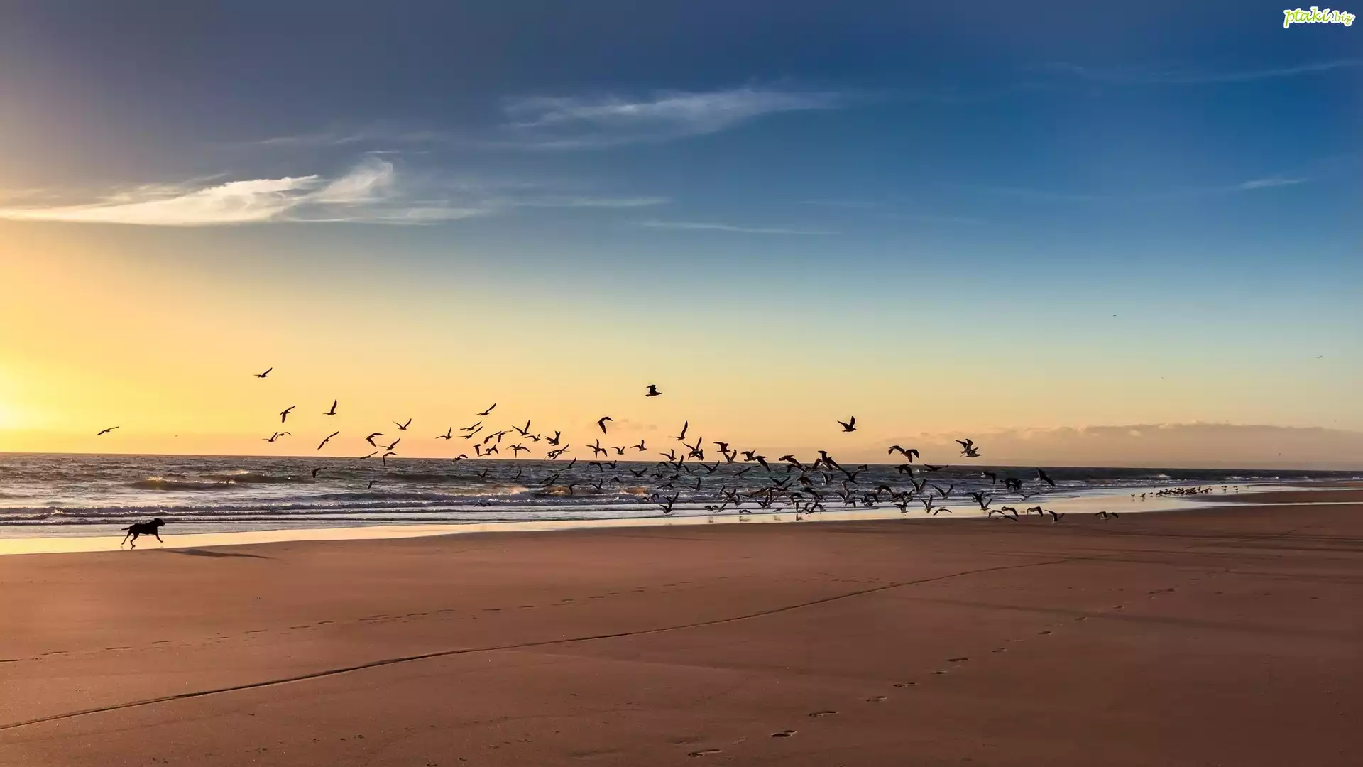 Morze, Plaża, Poranek, Wschód Słońca, Ptaki, Pies