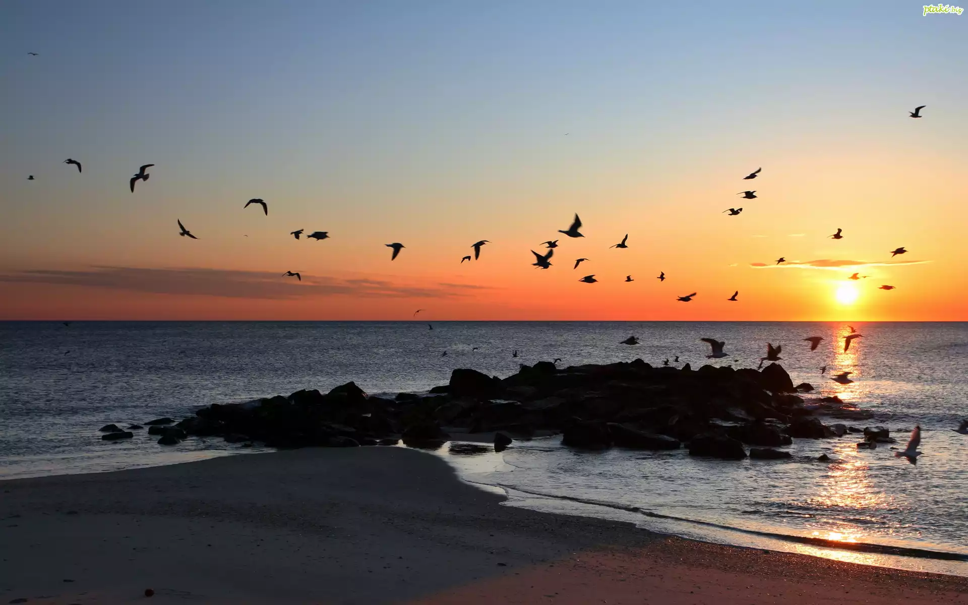Plaża, Morze, Kamienie, Ptaki, Wschód, Słońca