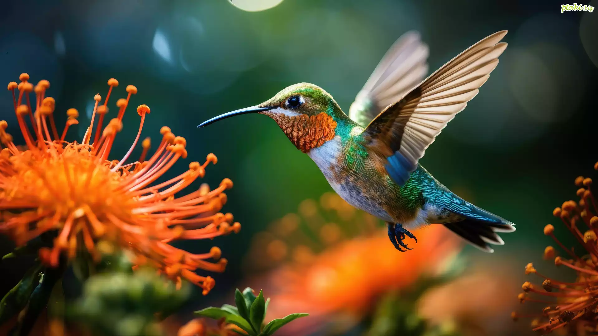 Ptak, Koliber, Skrzydła, Pomarańczowe, Kwiaty, Zielone tło