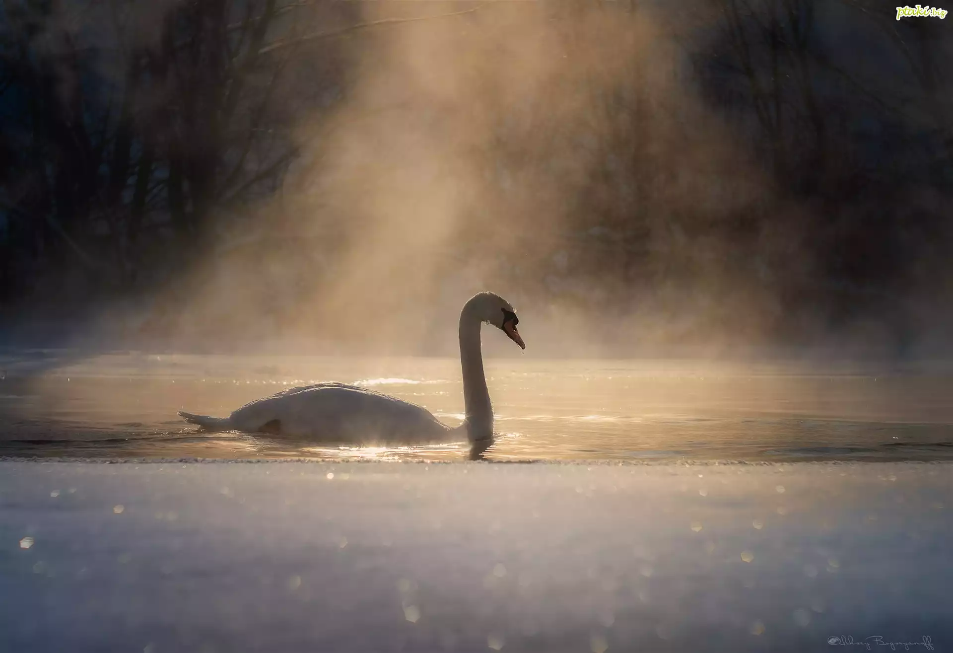 Łabędź, Zima, Poranek, Poświata, Mgła