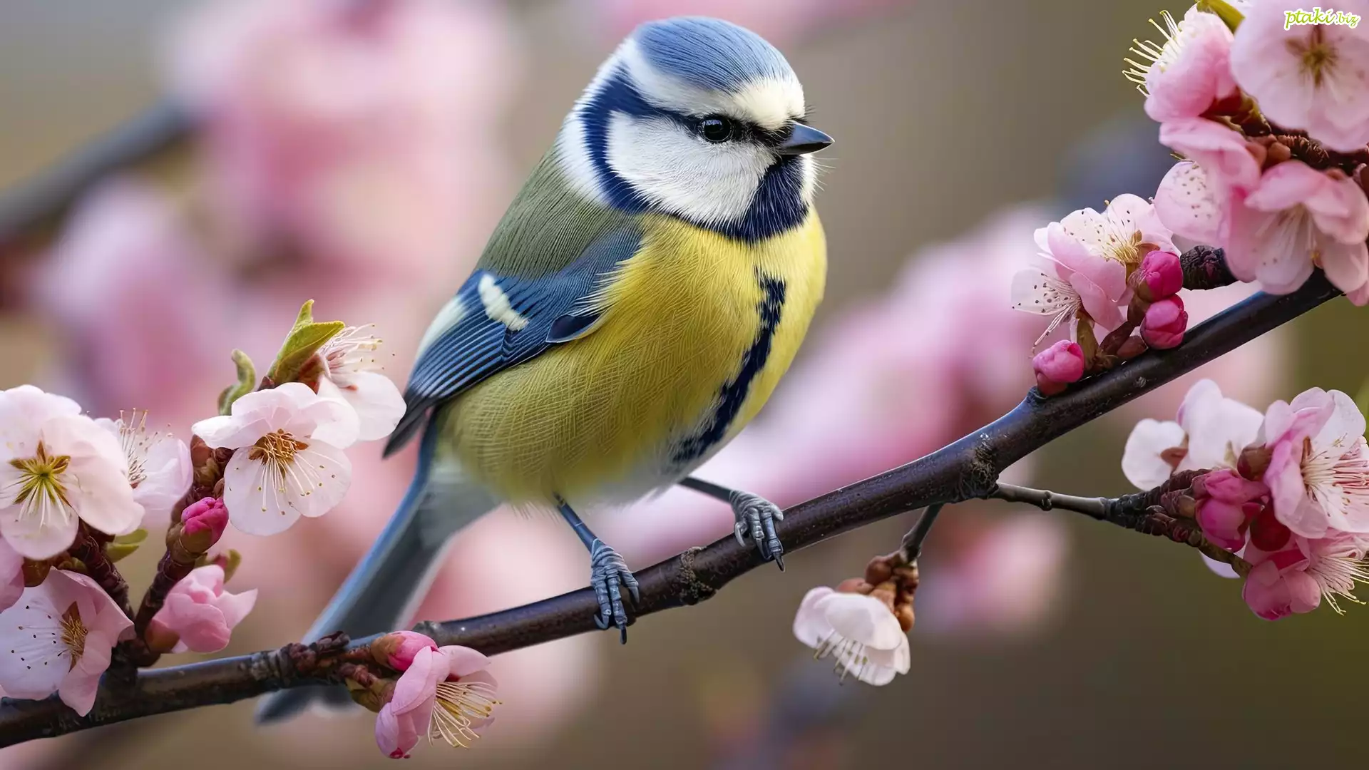 Ptak, Sikorka, Modraszka zwyczajna, Gałązka, Drzewo owocowe, Różowo-białe, Kwiaty