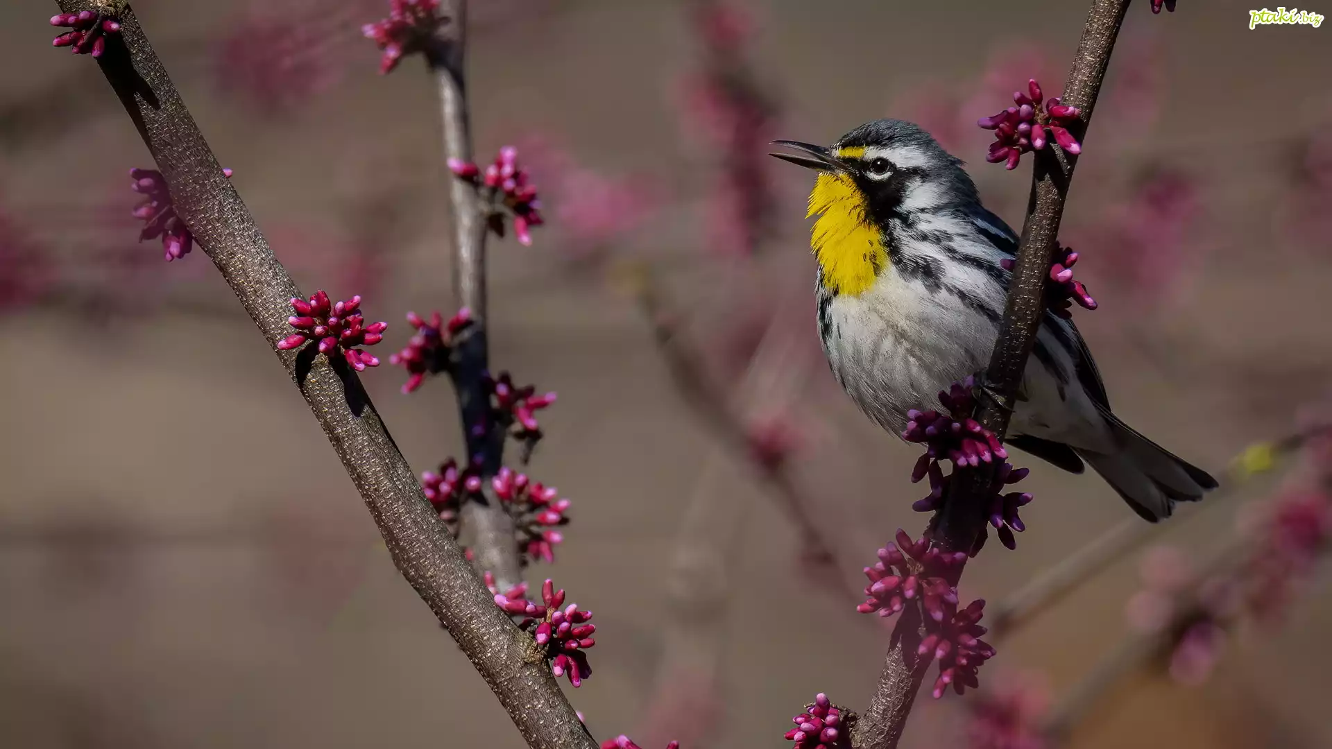 Ptak, Lasówka szarogrzbieta, Gałązki, Bordowe, Pąki