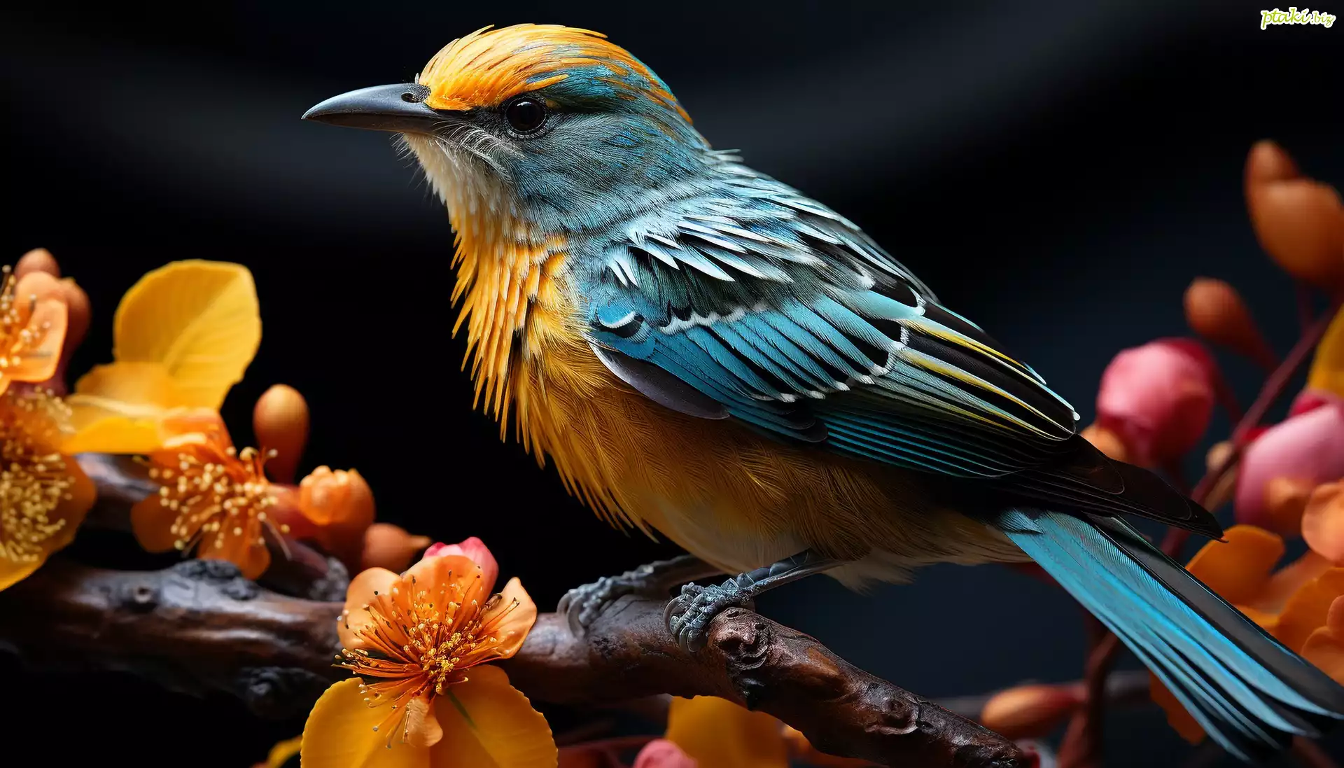 Kolorowy, Ptak, Gałąź, Kwiaty, Grafika