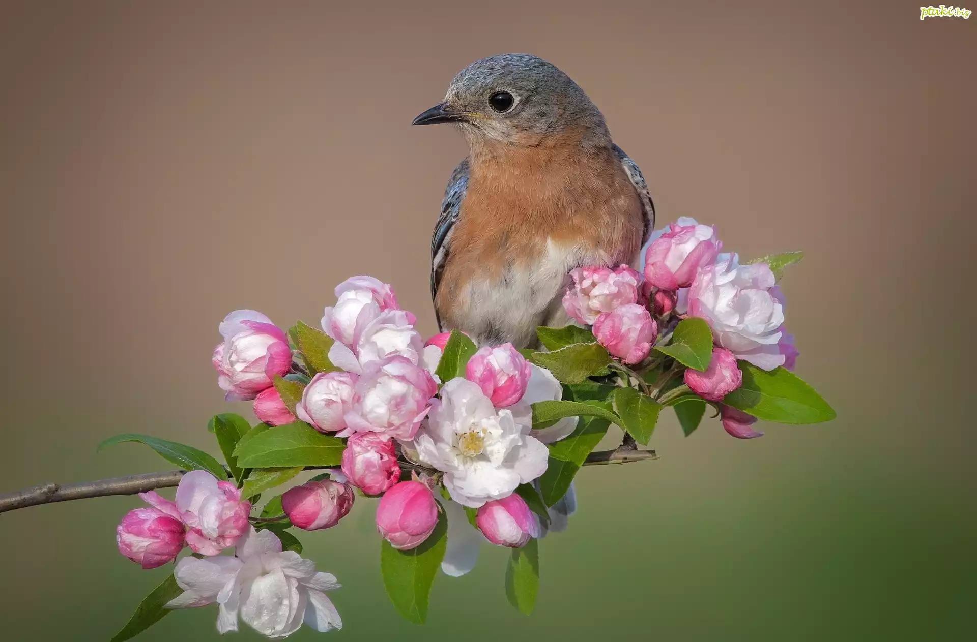 Ptak, Błękitnik rudogardły, Gałąź, Kwiaty
