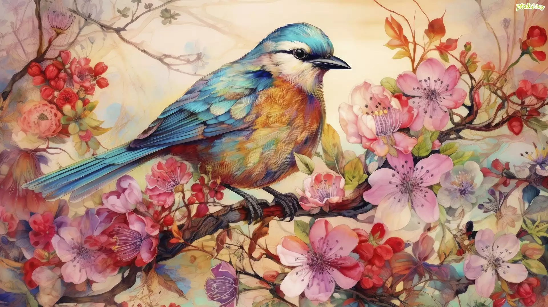 Grafika, Ptak, Gałązka, Kwiaty, Kolorowe