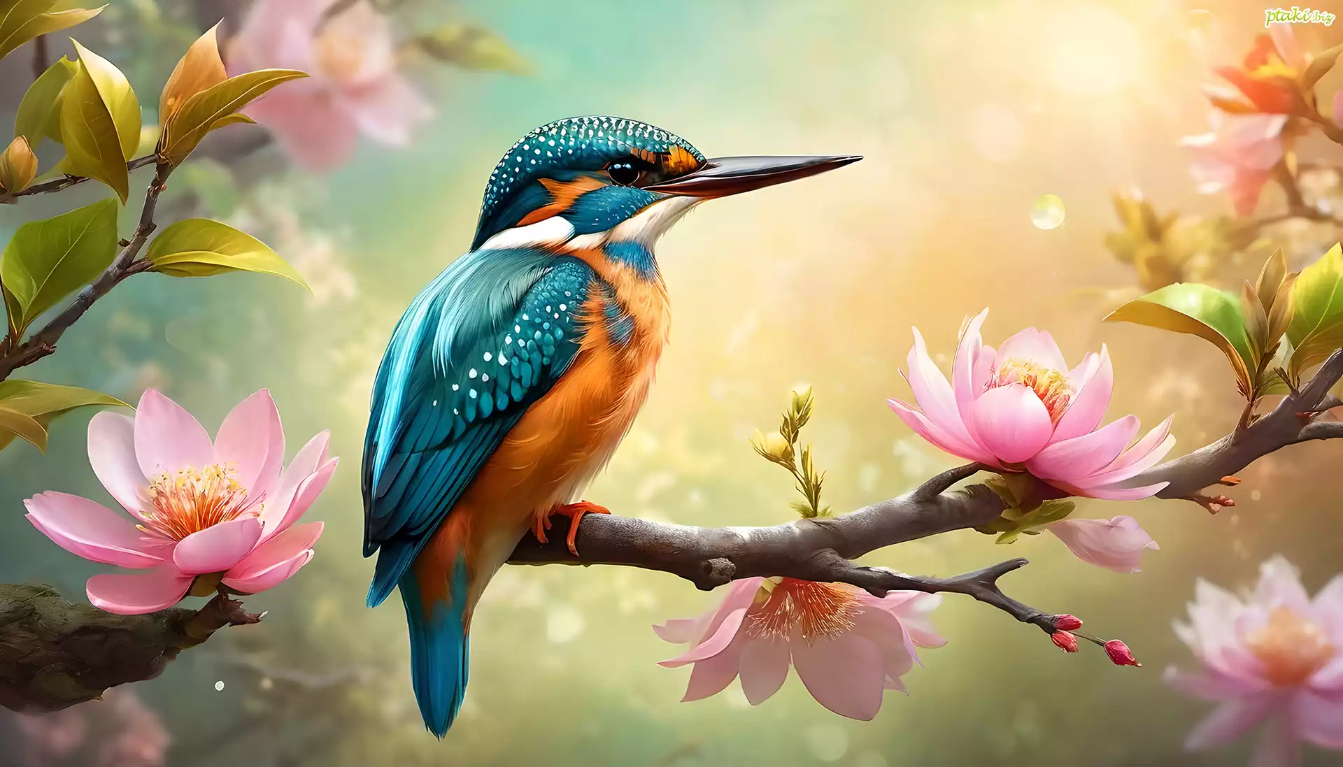 Zimorodek, Ptak, Gałązka, Grafika, Kwiaty