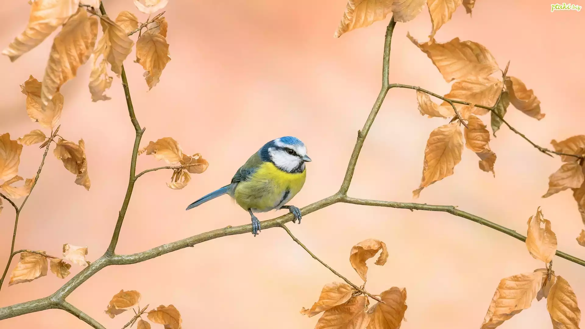 Ptak, Sikorka, Modraszka zwyczajna, Gałązka, Liście