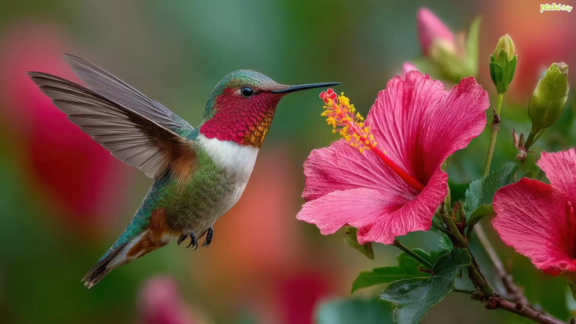 Ptak, Koliber, Lot, Kwiat, Różowy, Hibiskus, Pąki, Łodyga, Grafika AI