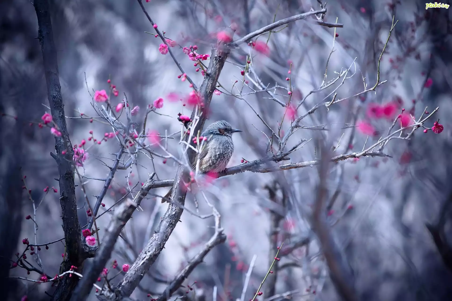 Ptak, Szpak, Gałęzie, Kwiatki, Wiosna