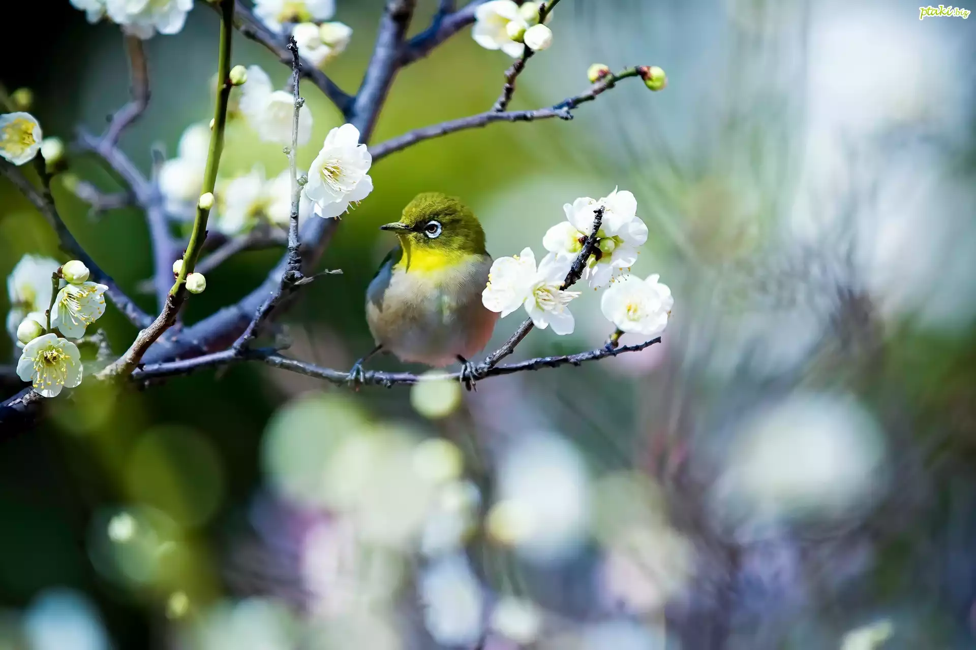 Ptak, Szlarnik japoński, Gałązka, Kwiaty, Wiosna