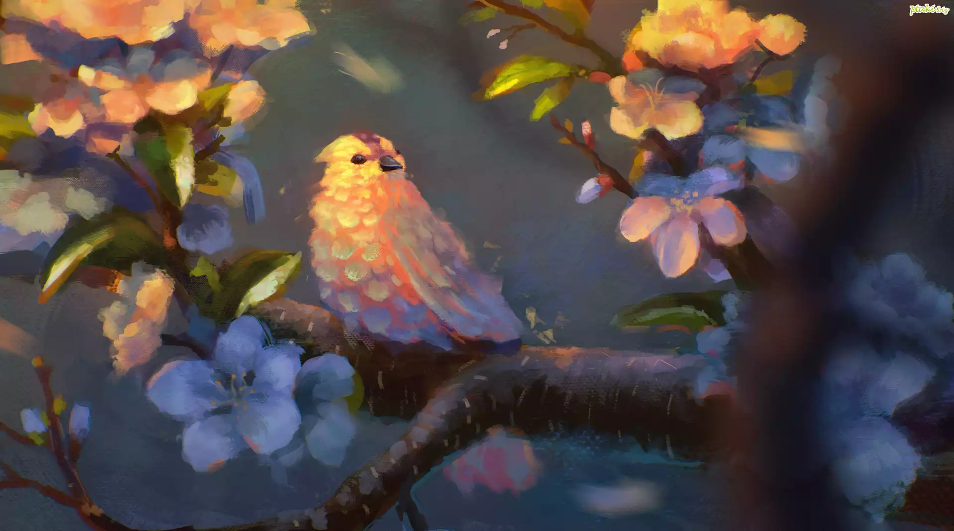 Ptak, Gałąź, Liście, Kwiaty, Grafika