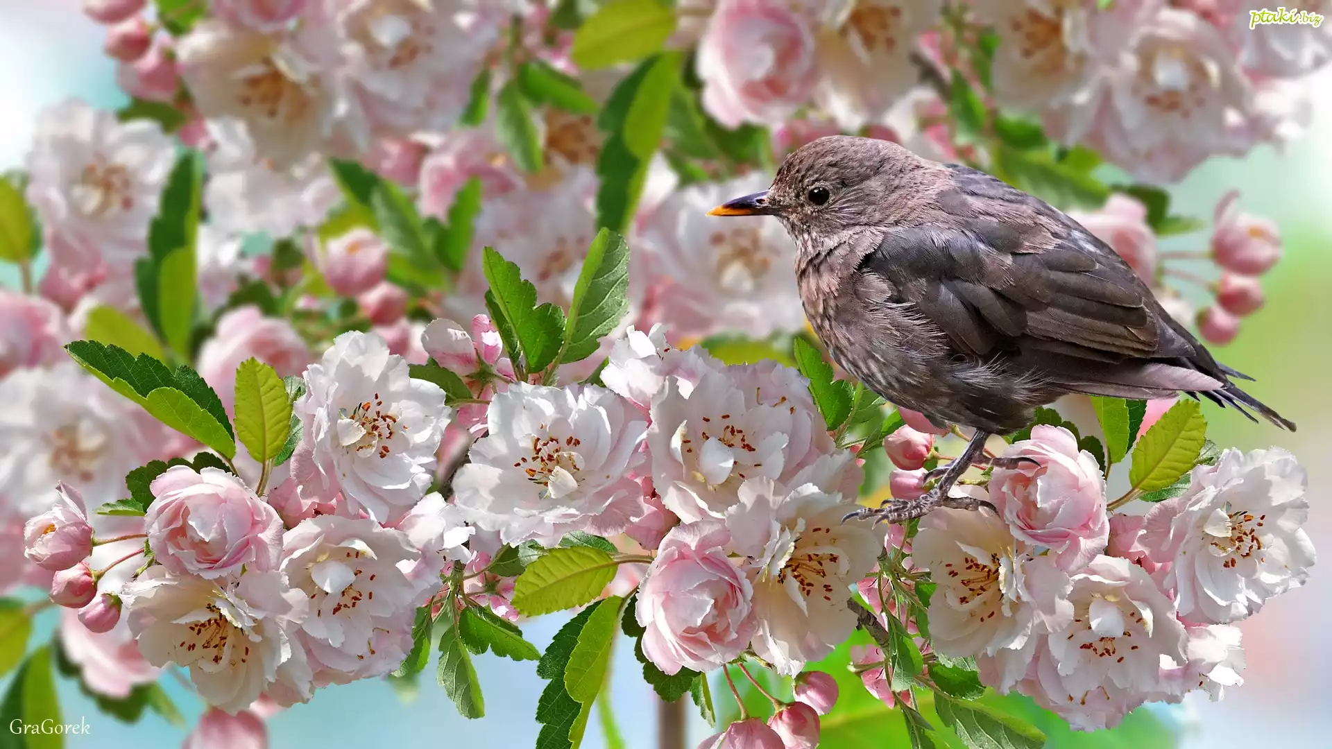 Ptak, Drzewo owocowe, Gałązka, Kwiaty, Grafika