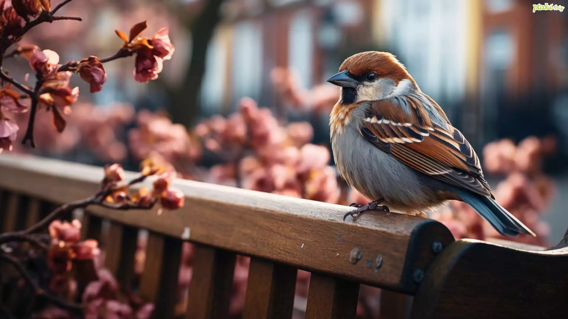 Wróbel, Ptak, Ławka, Rozmyte, Kwiaty