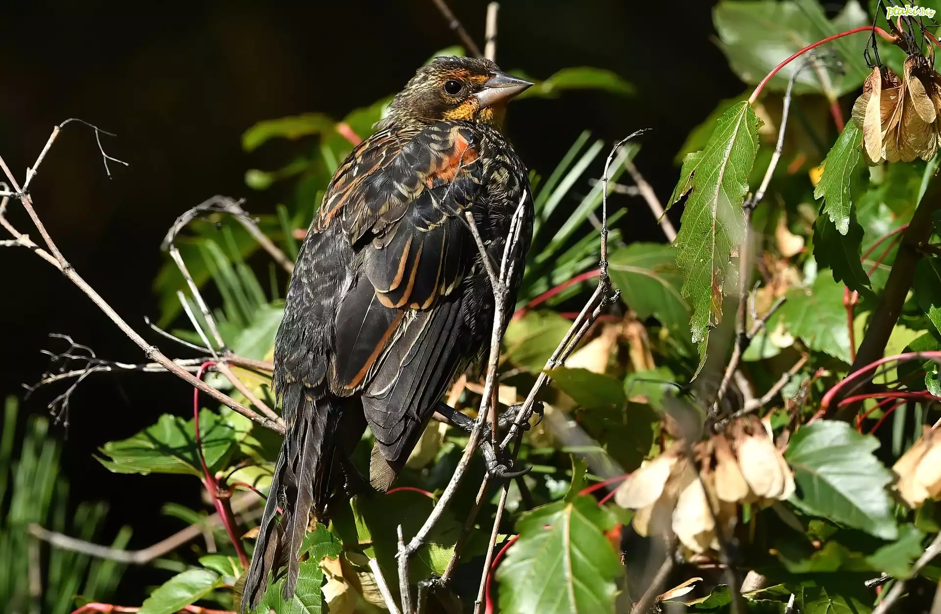 Kos czerwonoskrzydły, Samica, Ptak, Gałęzie, Liście