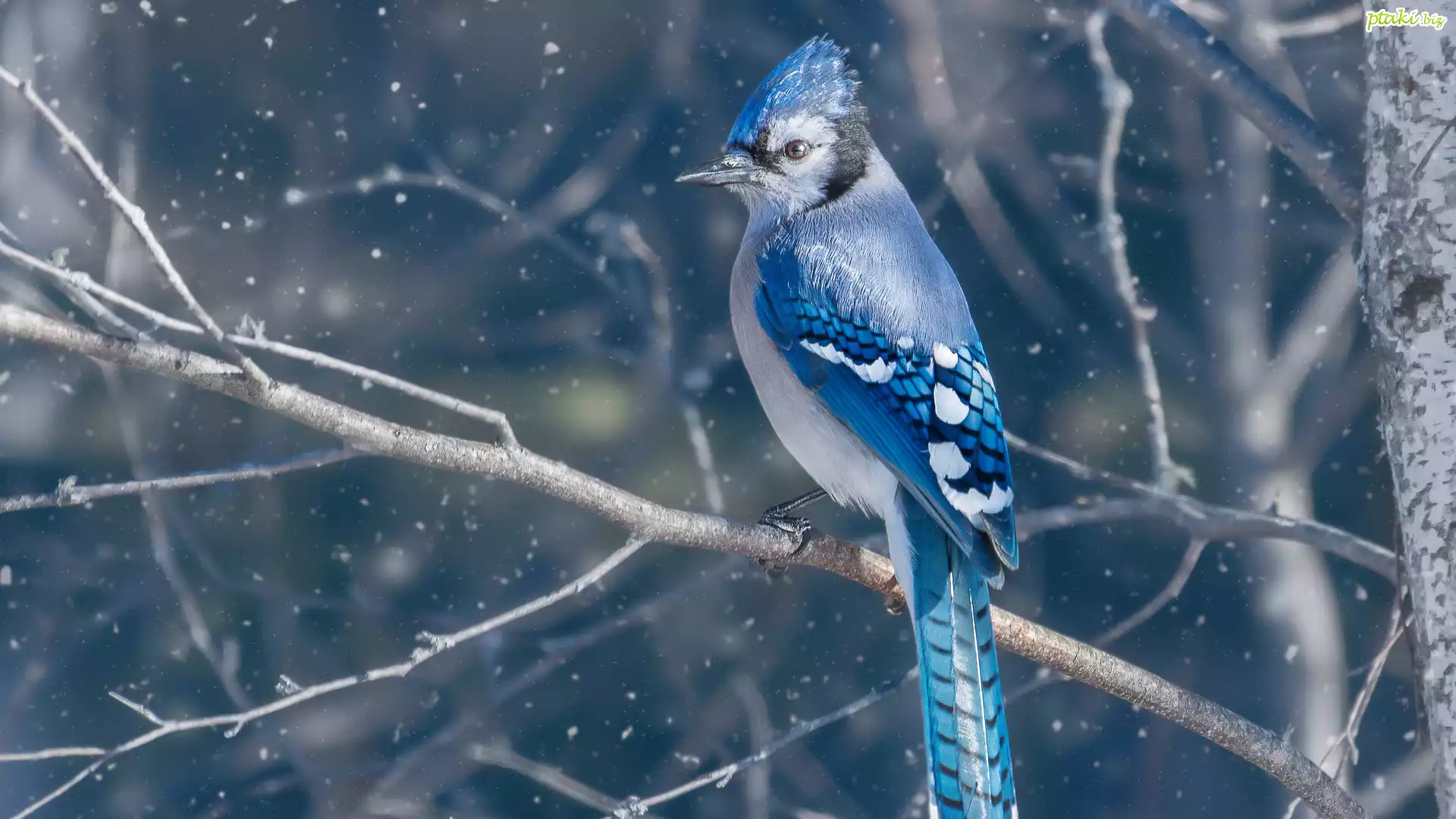 Ptak, Modrosójka błękitna, Gałęzie, Płatki, Śniegu