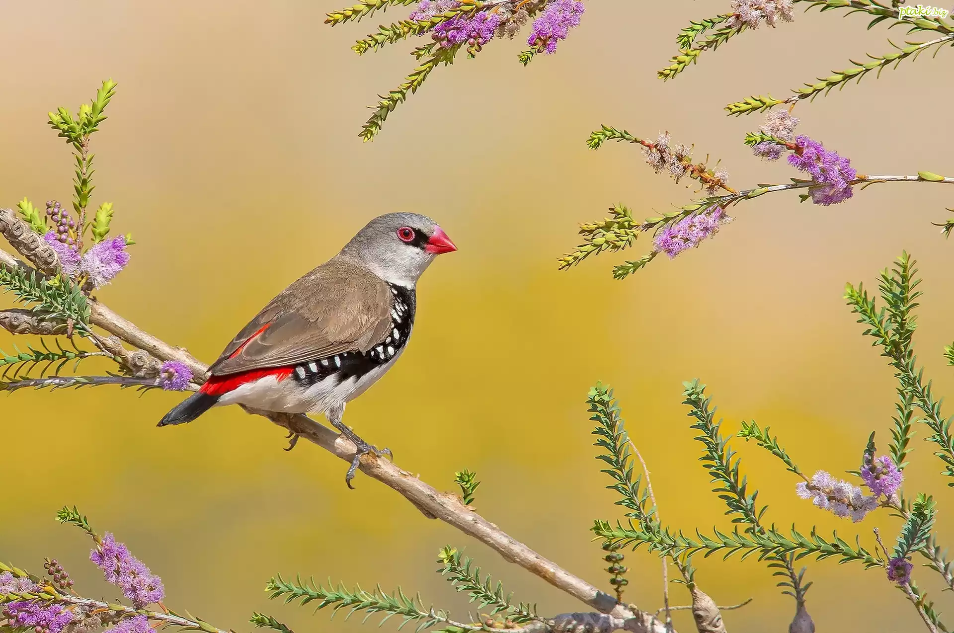 Ptak, Gałązka, Różowe, Kwiatuszki