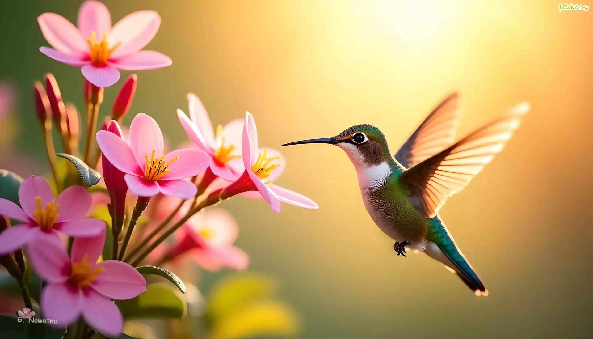 Koliber, Ptak, Różowe, Kwiaty, Grafika